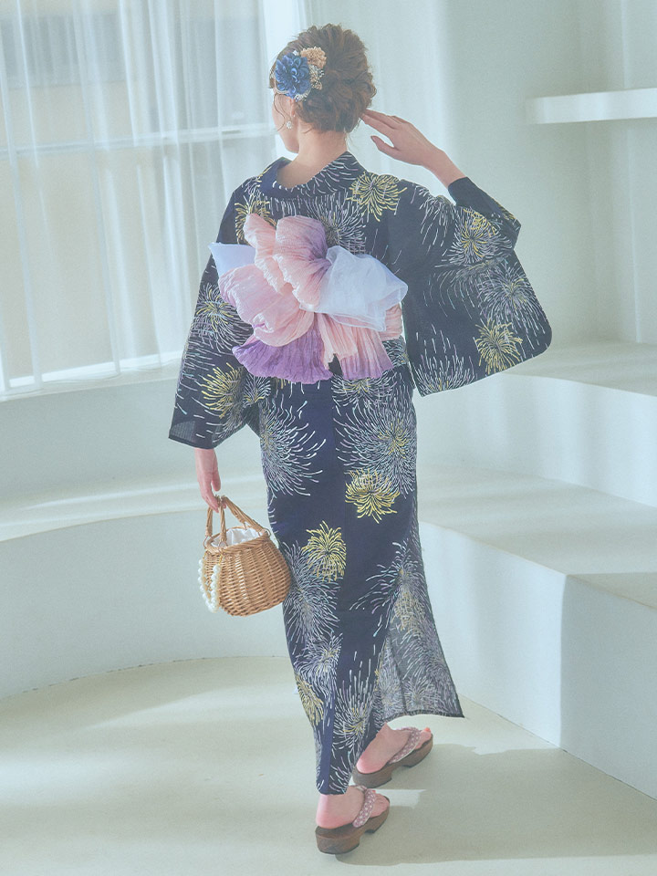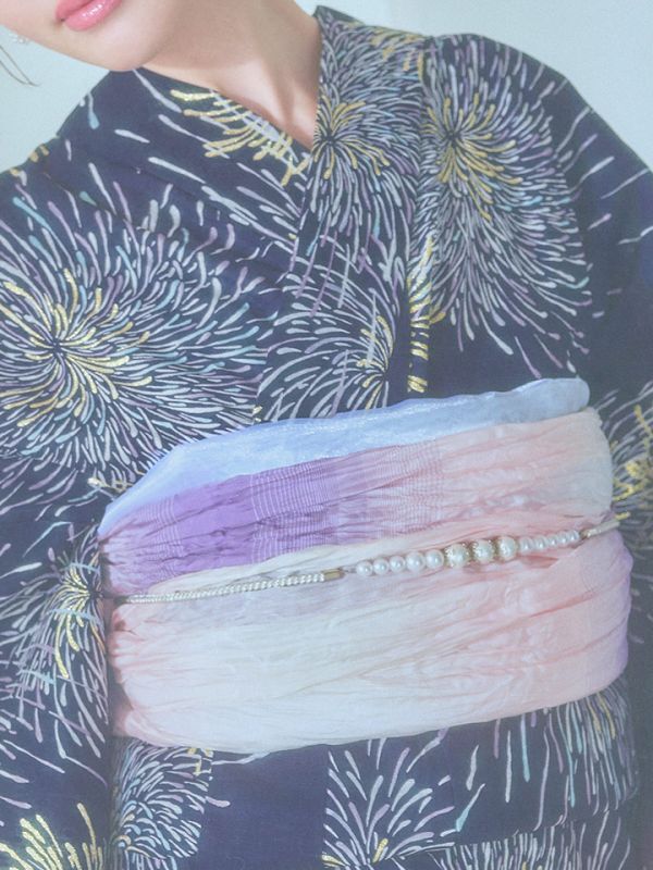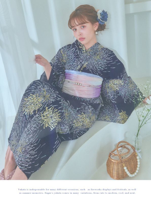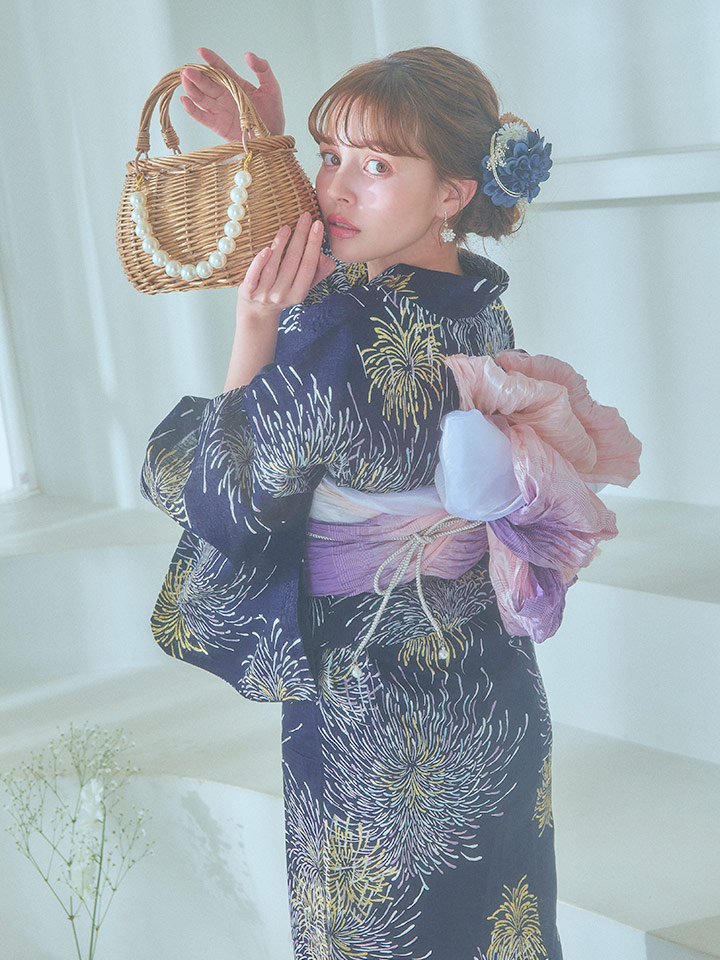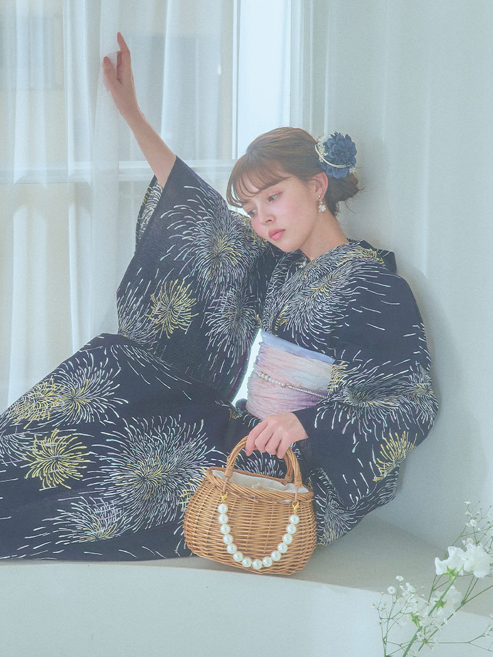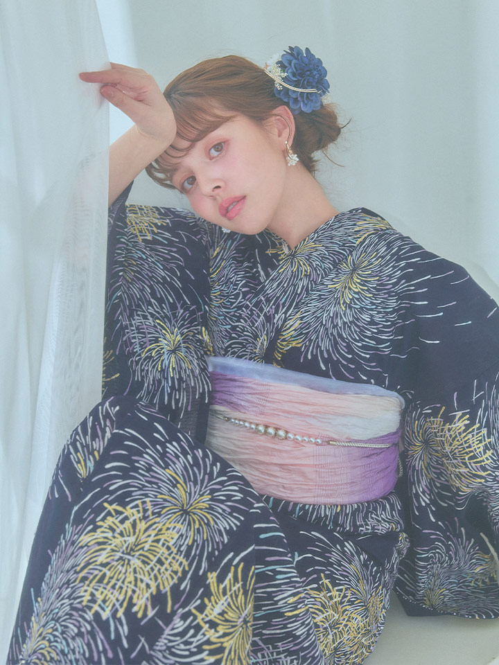 真っ黒な夜空にパープルやクールブルー、ゴールドのラメをあしらった花火がキラキラ輝く夏浴衣。