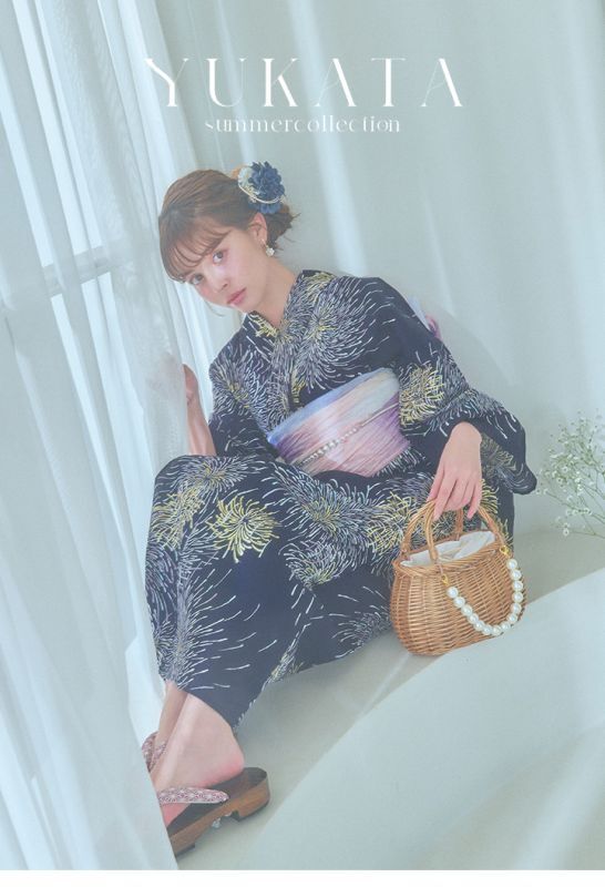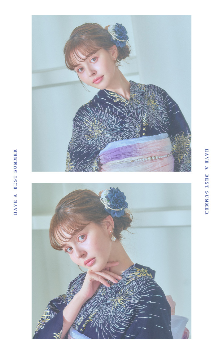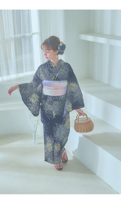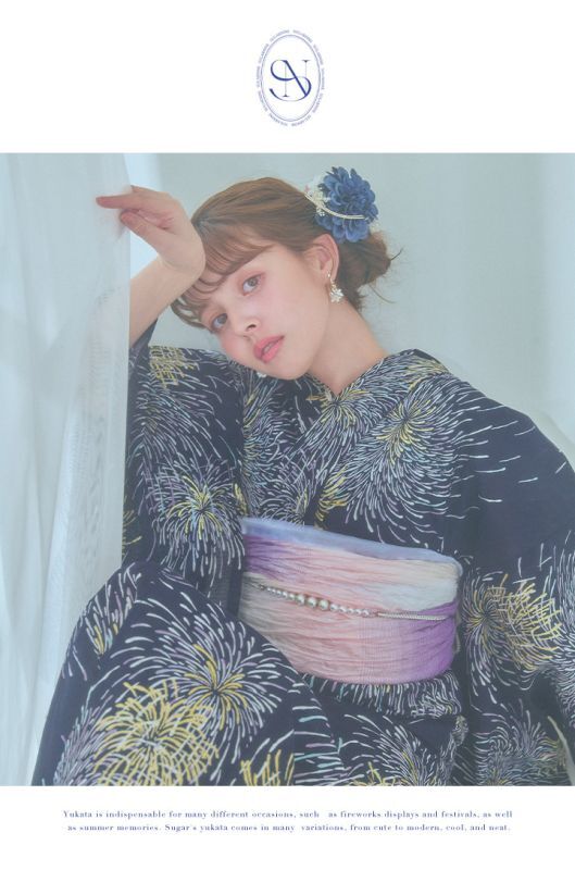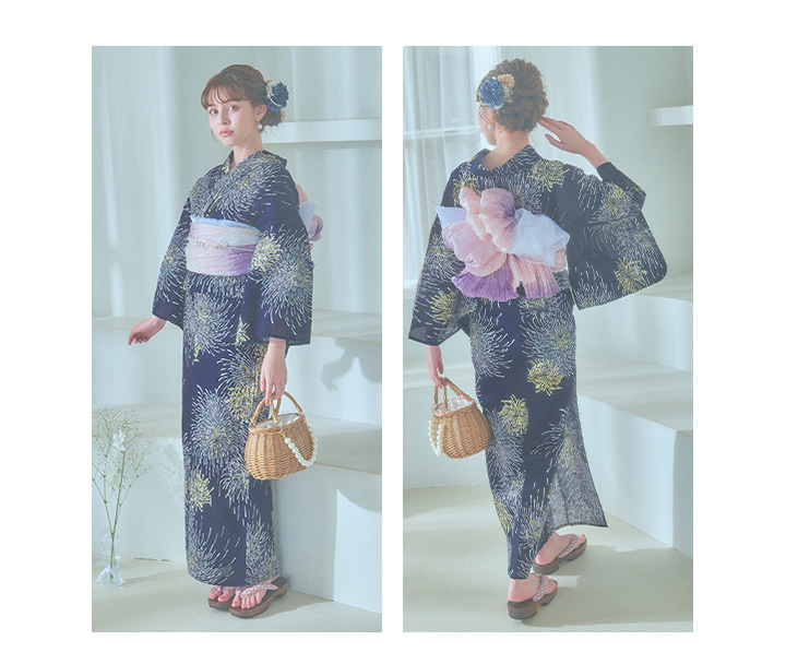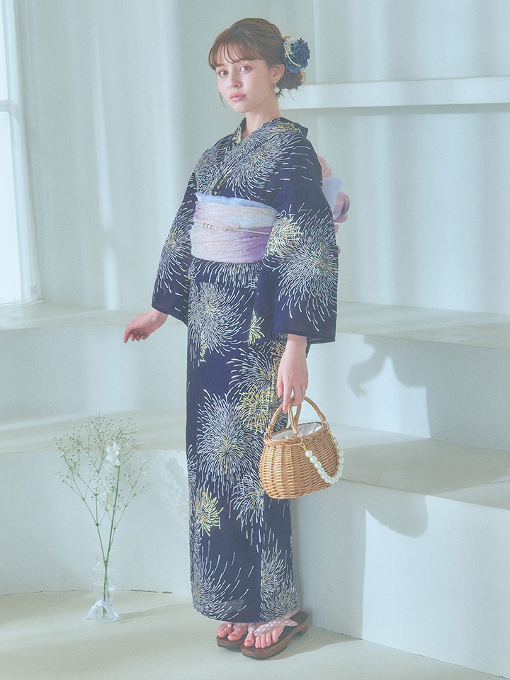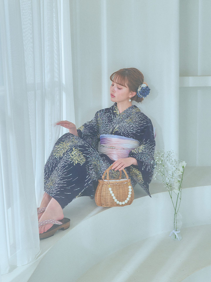 真っ黒な夜空にパープルやクールブルー、ゴールドのラメをあしらった花火がキラキラ輝く夏浴衣。
