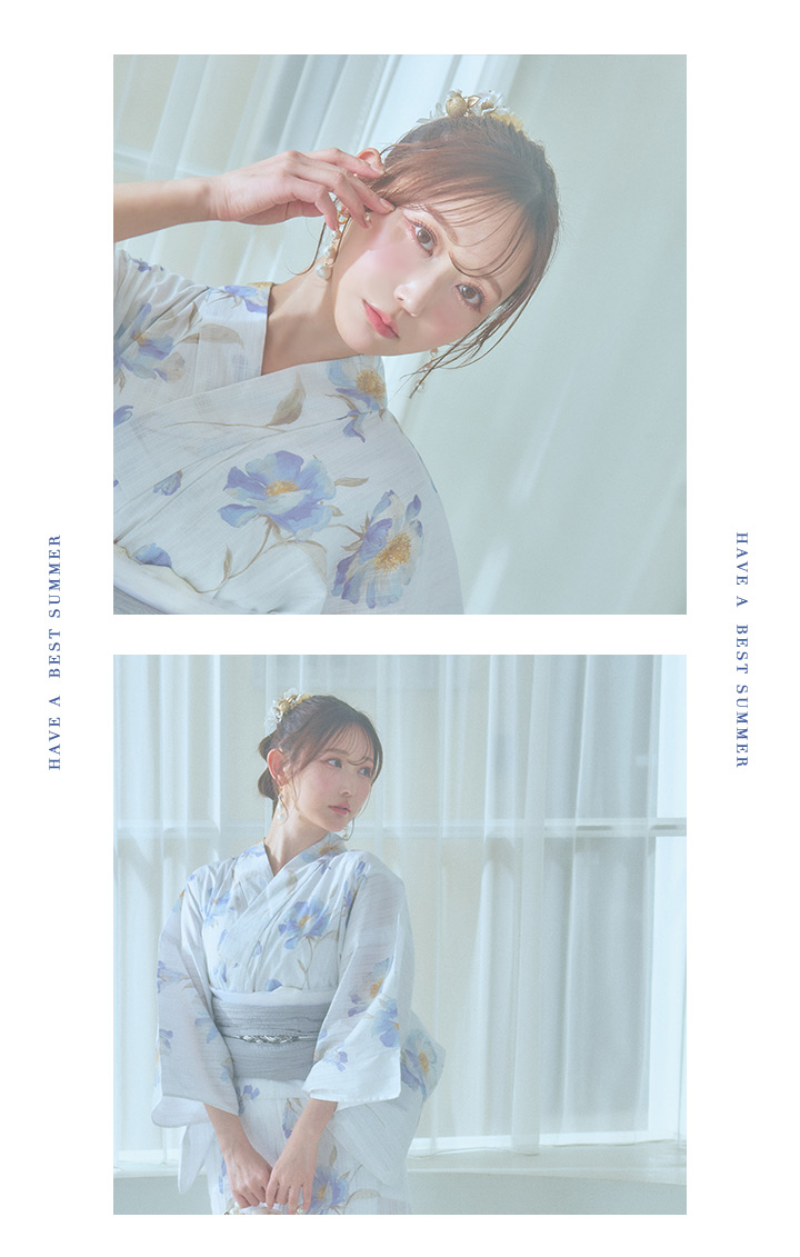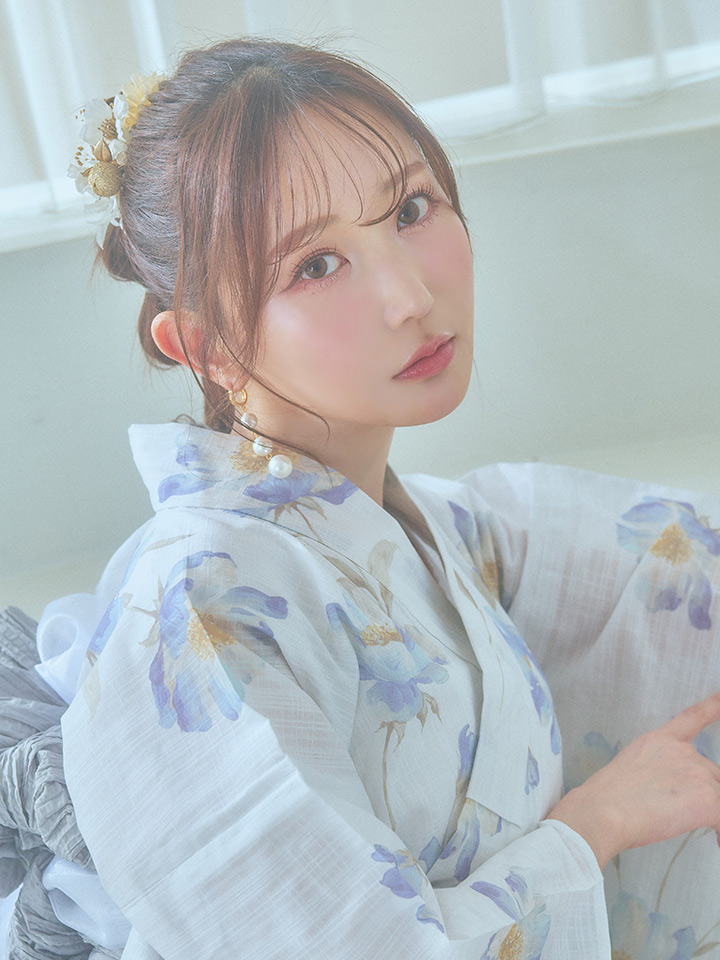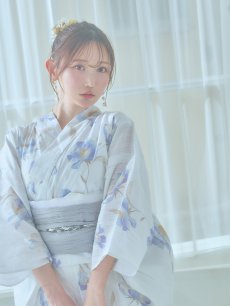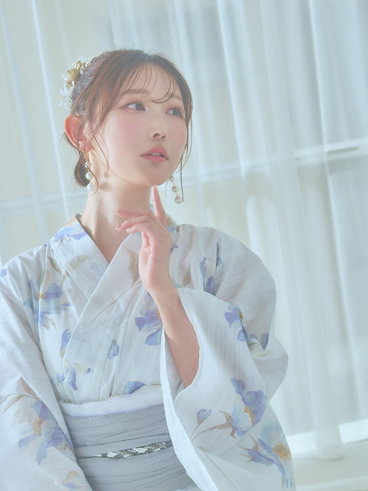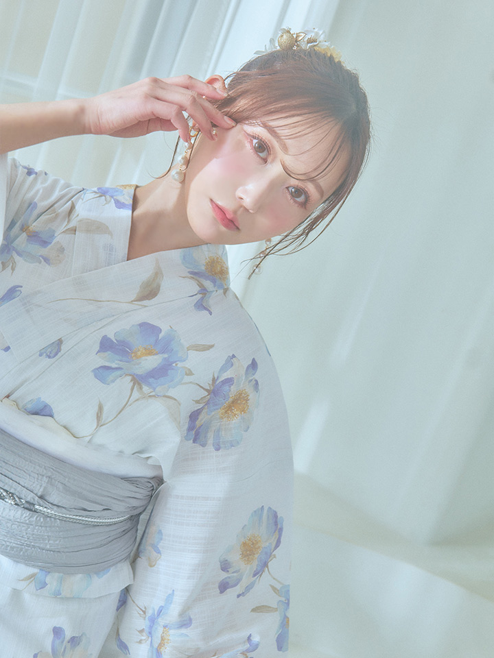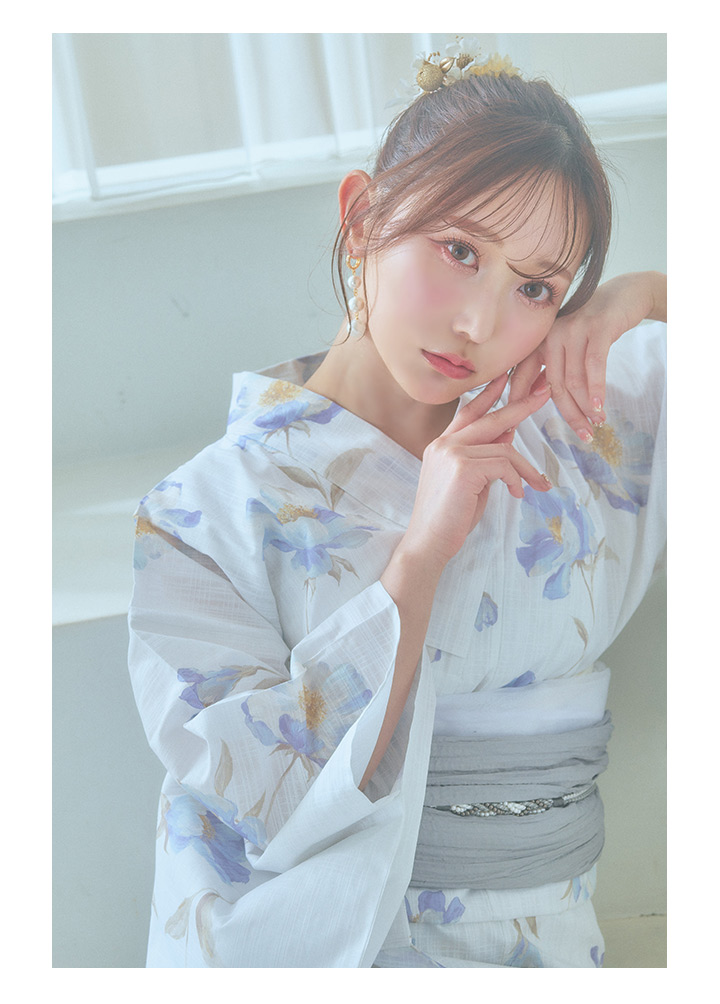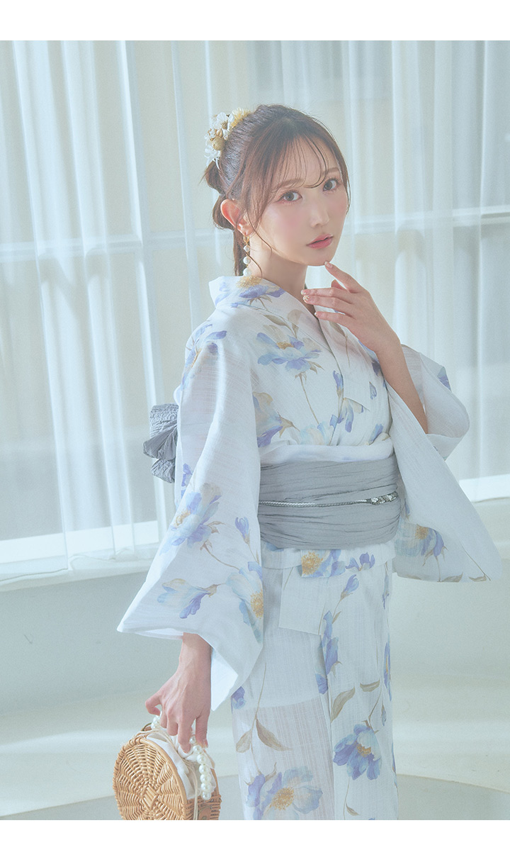 ホワイトのナチュラルチェック地に淡いブルーの牡丹が繊細で落ち着いた印象を残す夏浴衣。