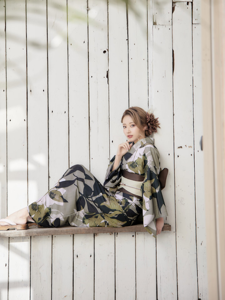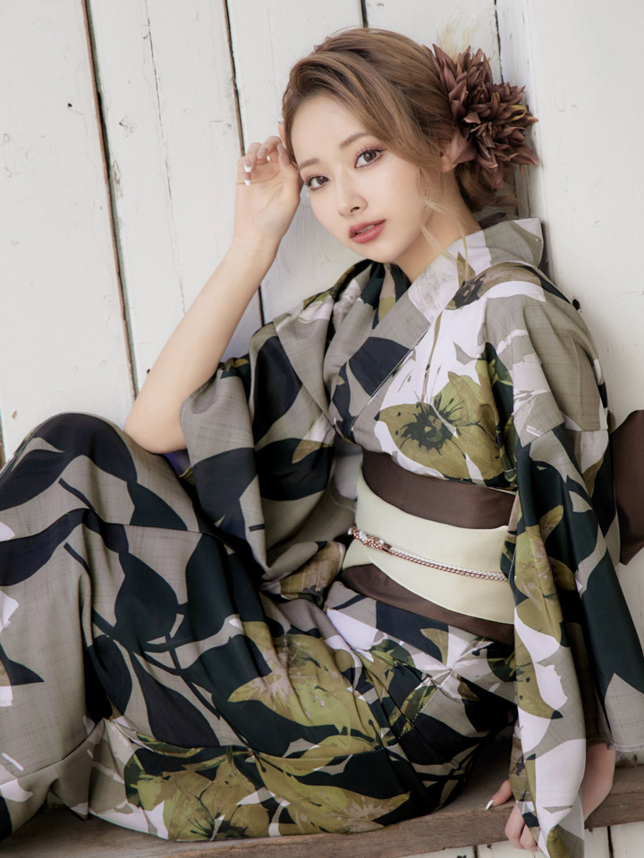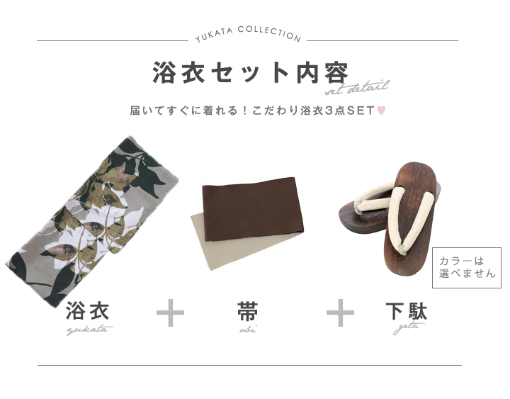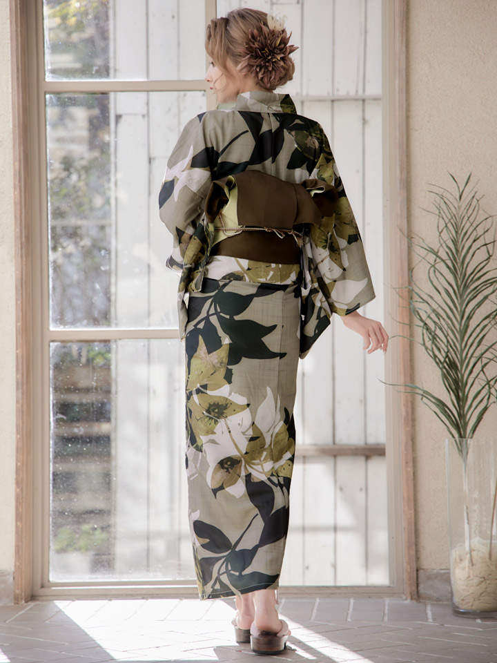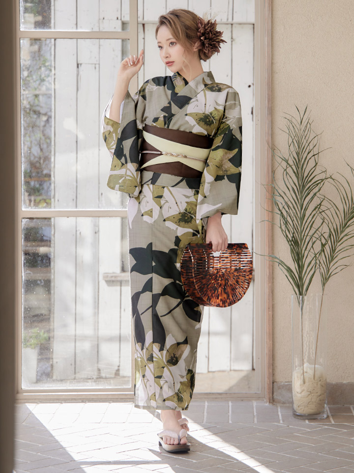 【即日発送】【オリジナル浴衣】ヘルシーリーフ柄浴衣 【浴衣3点セット 浴衣/帯/下駄】 [YMT]
