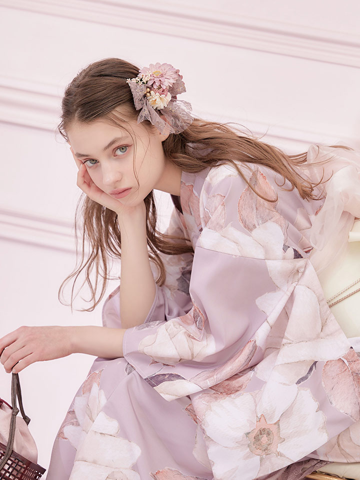 大人ガーリーな絶妙なピンク地に可憐な花が咲き誇り、