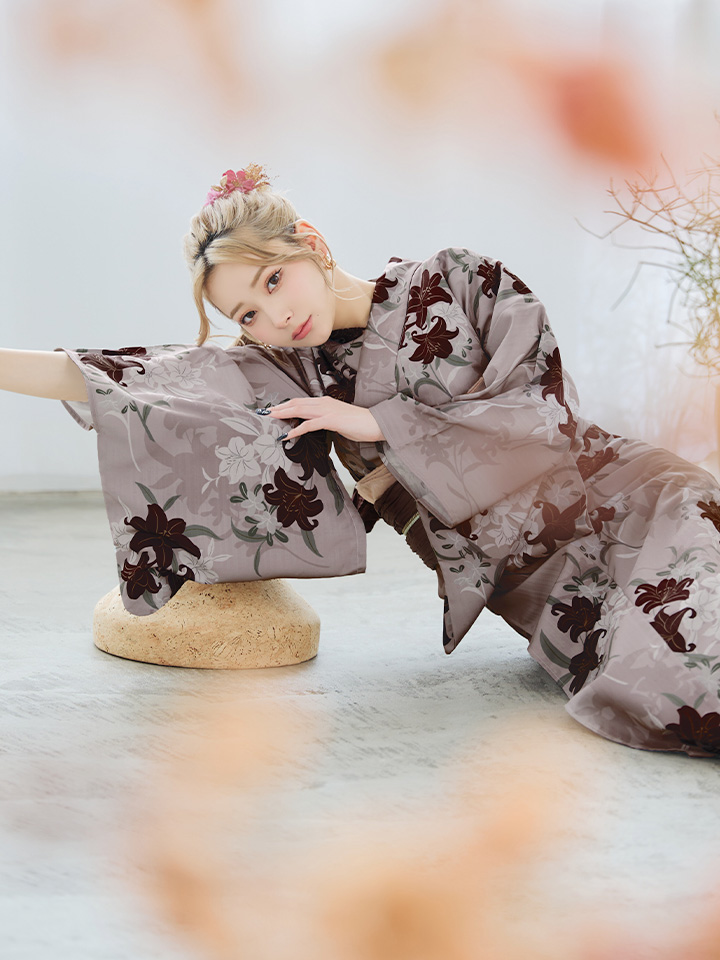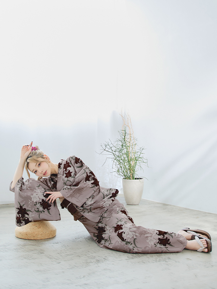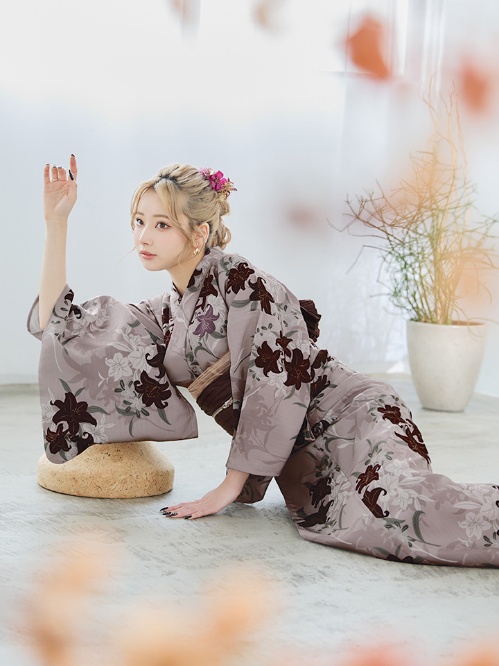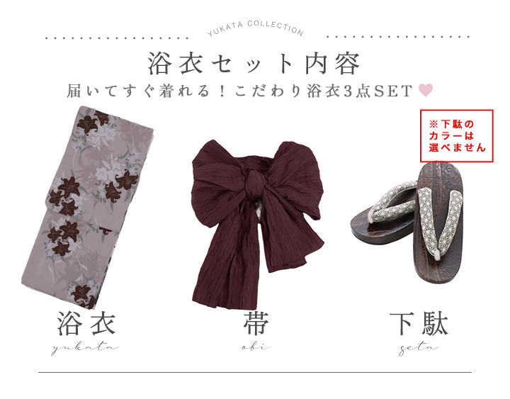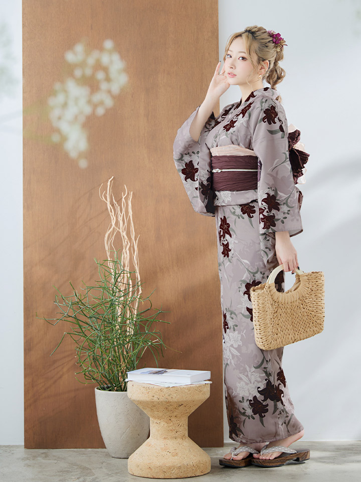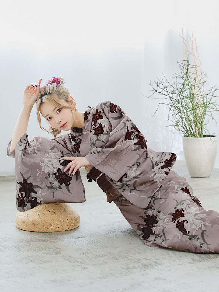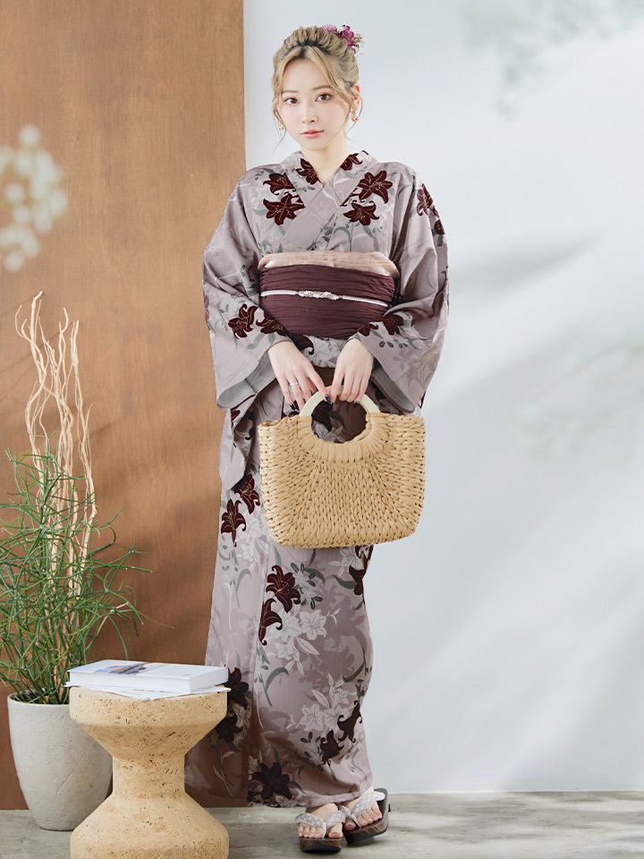 【即日発送】ブラウンパープルリリー浴衣 【浴衣3点セット 浴衣/帯/下駄】 [YMT] [Y-8088-ok-BR-F-24PY]