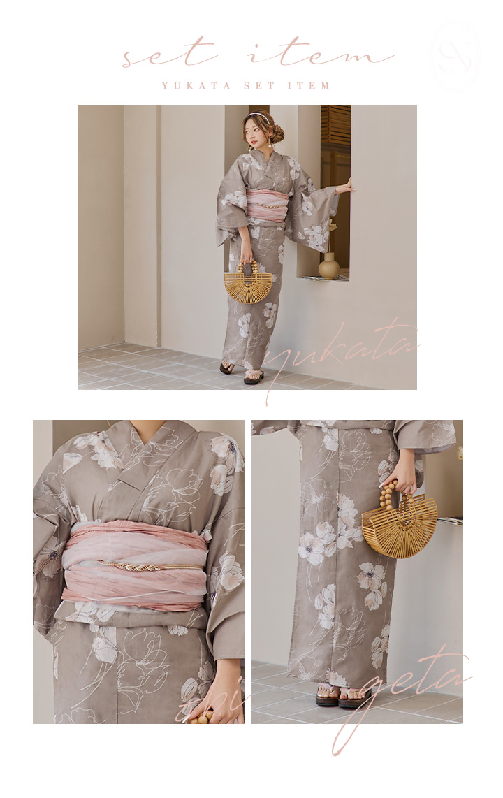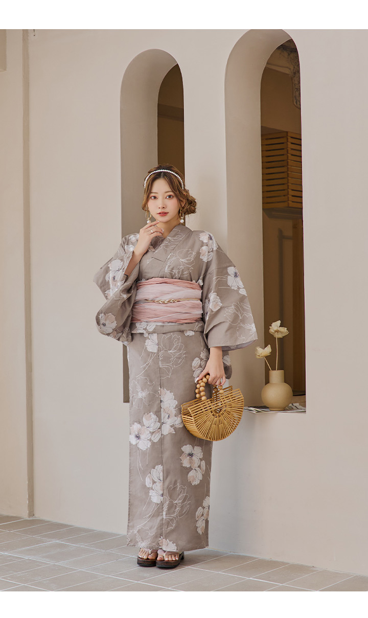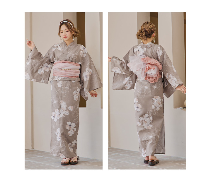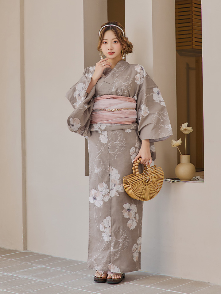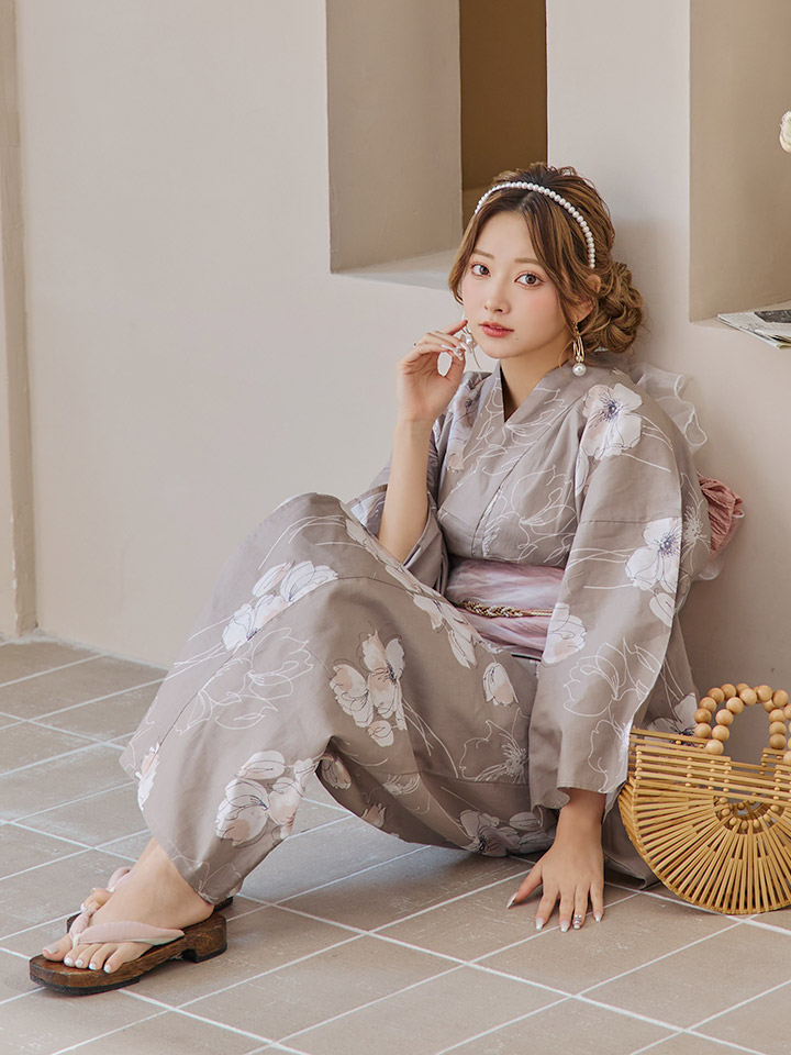 【即日発送】グレージュ線画フラワー浴衣 【浴衣3点セット 浴衣/帯/下駄】 [YMT] [Y-8005-kj-GY-F-24PY]