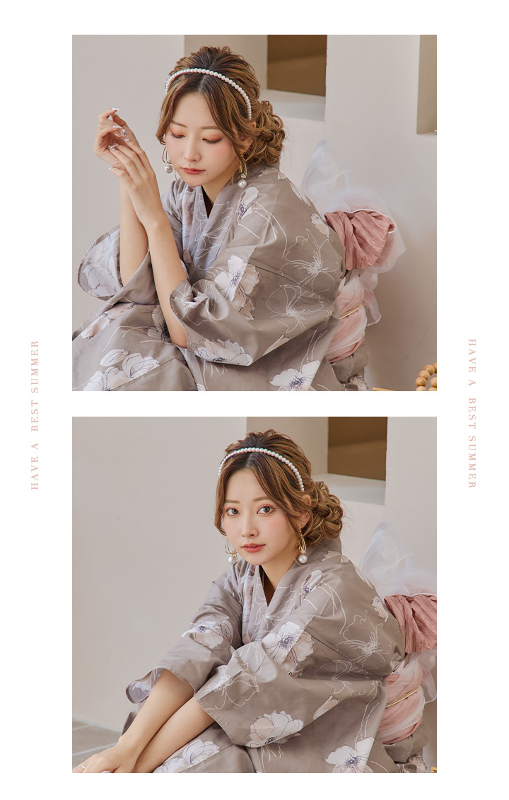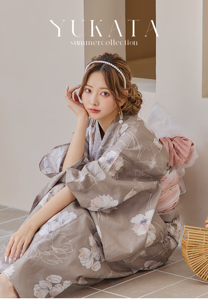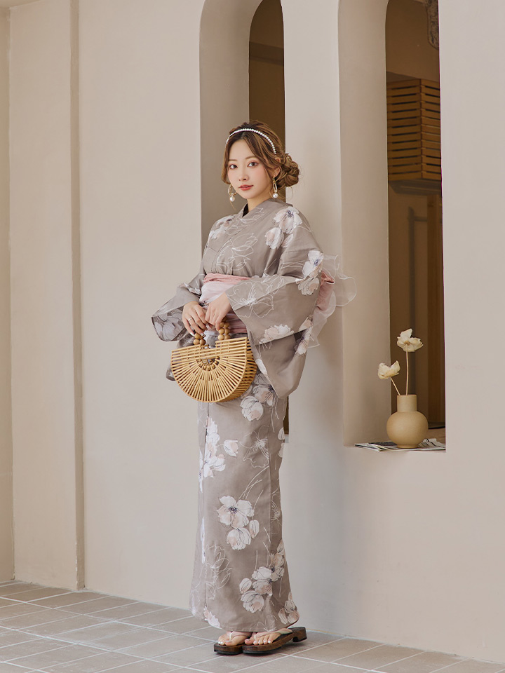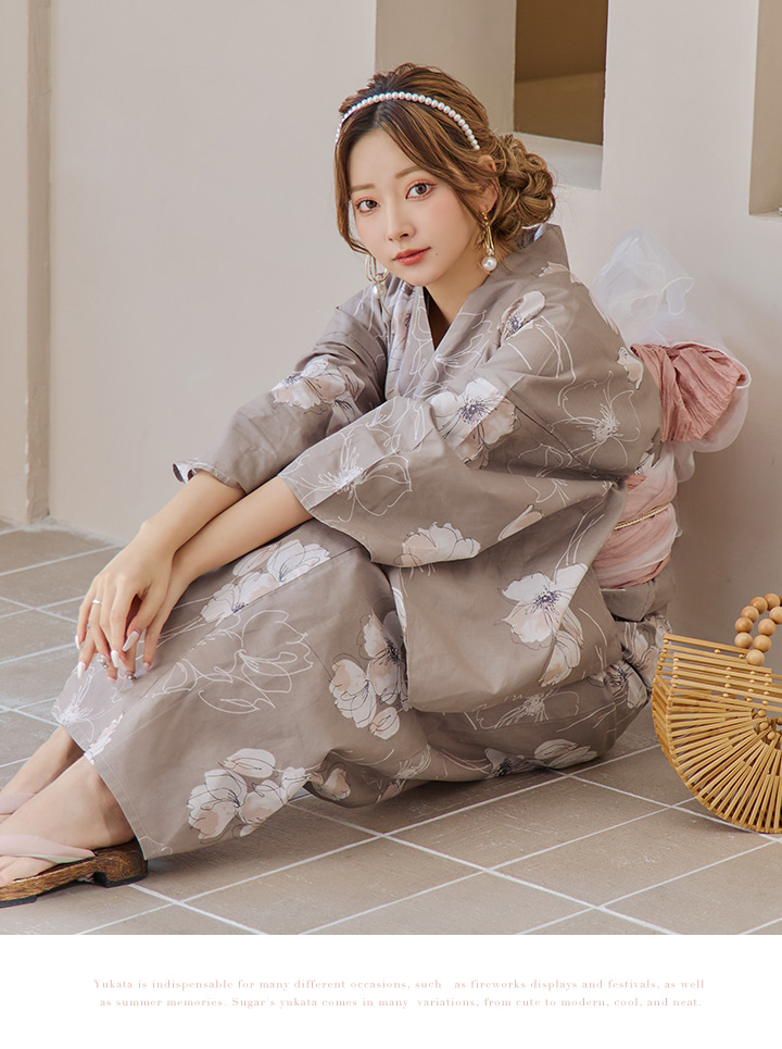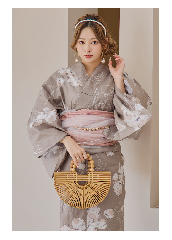 【即日発送】グレージュ線画フラワー浴衣 【浴衣3点セット 浴衣/帯/下駄】 [YMT] [Y-8005-kj-GY-F-24PY]