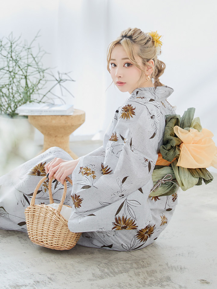 グレーチェックの生地にオレンジのマーガレットが咲くレトロモダンな夏浴衣。♥