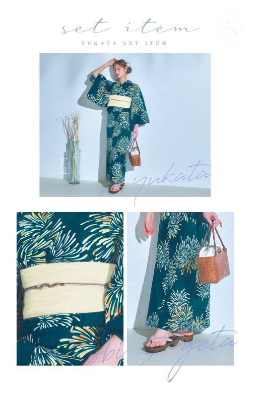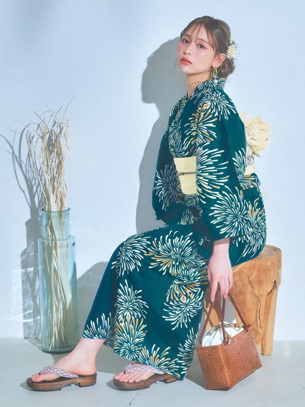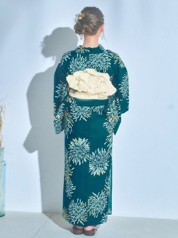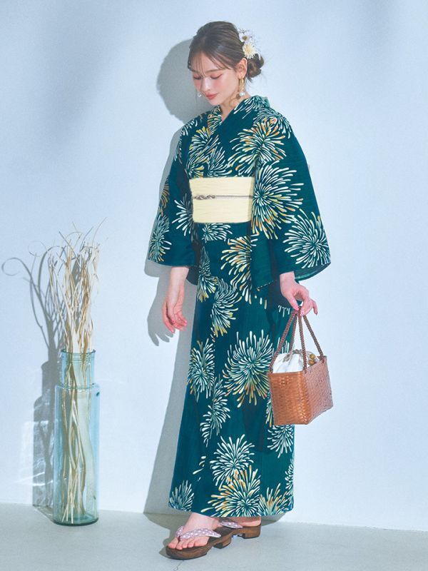 【即日発送】エメラルドグリーン×花火浴衣 【浴衣3点セット 浴衣/帯/下駄】 [YMT] [Y-9030-ok-GR-F-24IE]