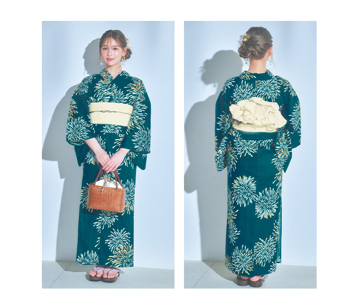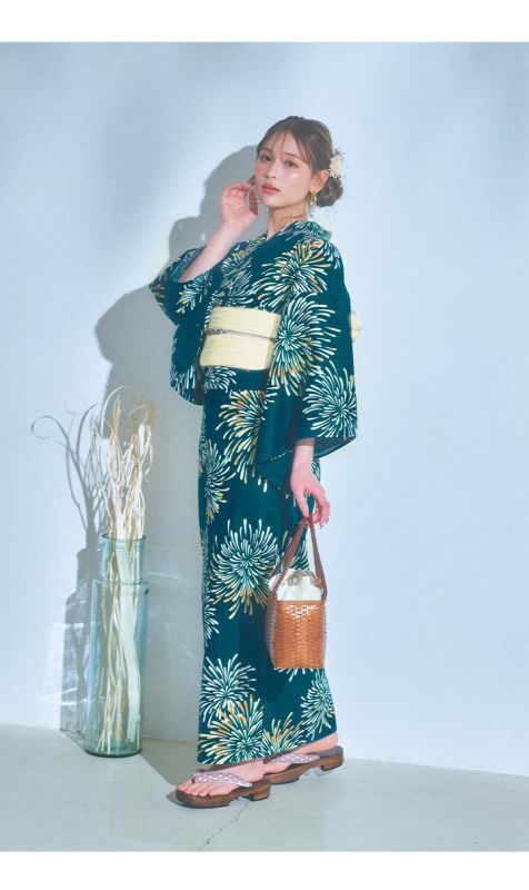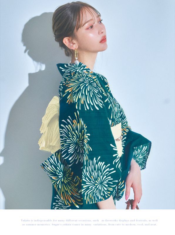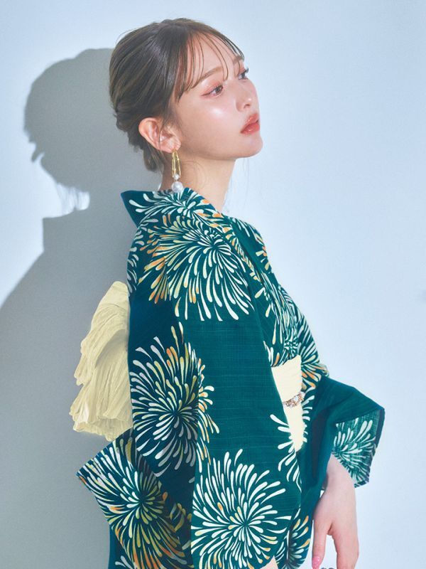 イエロー調のグラデーション花火がエメラルドグリーンの背景に美しく映える鮮やかな夏浴衣♥