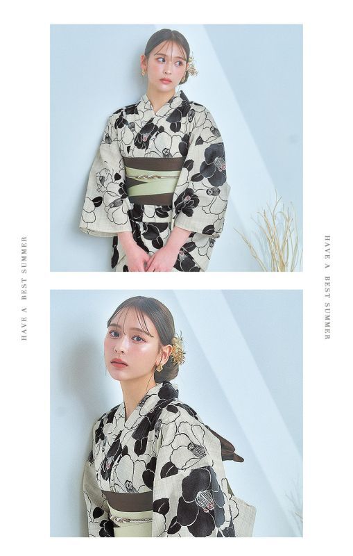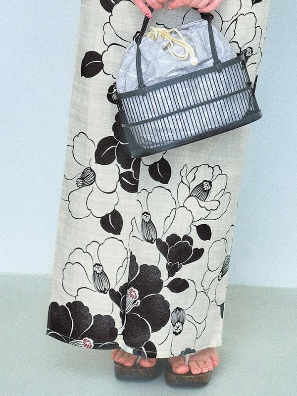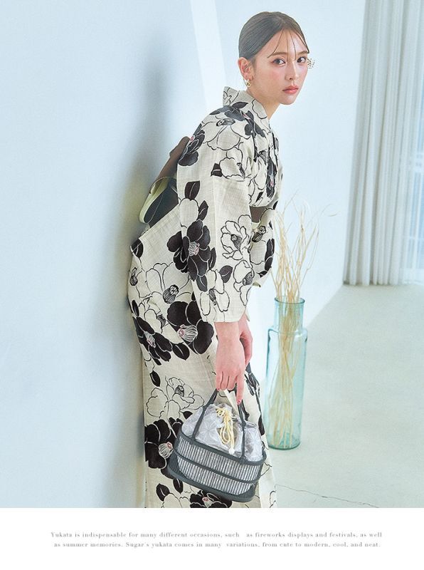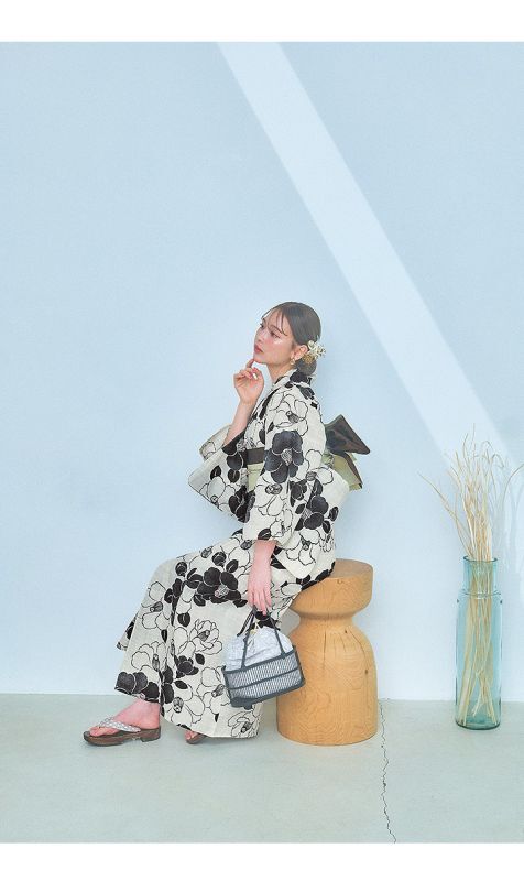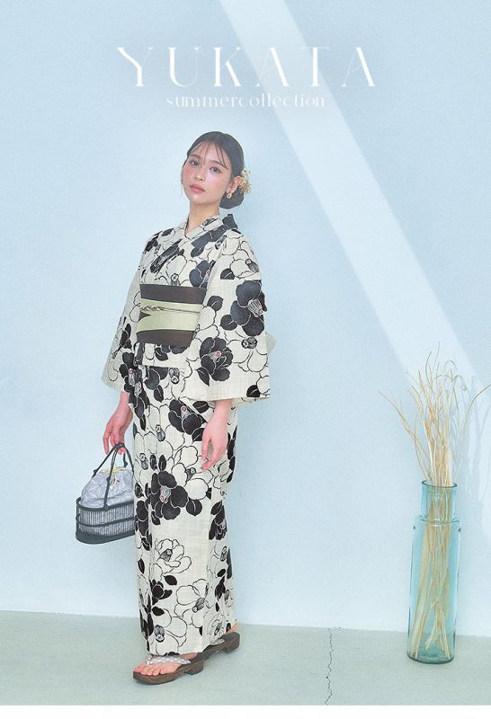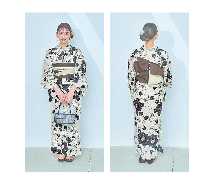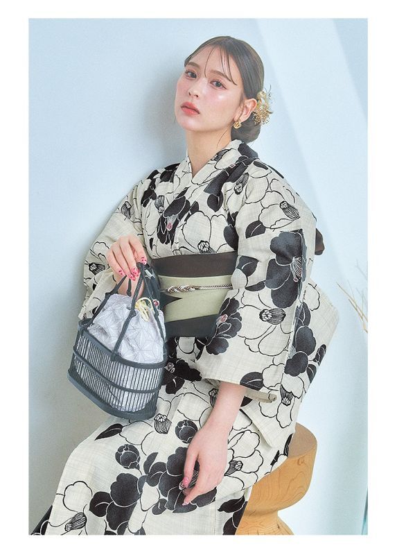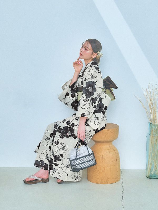 ホワイトグレーの小柄チェック地にモノトーンツバキを乗せた大正モダン夏浴衣♥