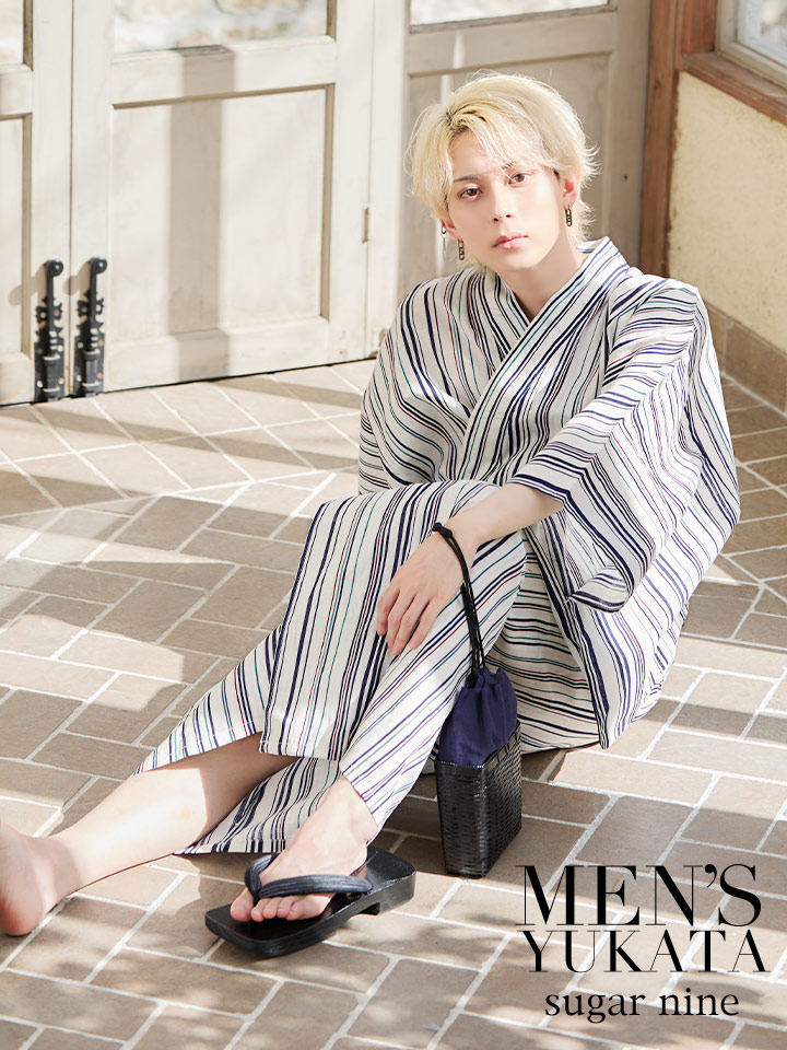 【即日発送】【メンズ浴衣】白地×スタイリッシュストライプ浴衣【浴衣・帯・下駄セット】[YMT]