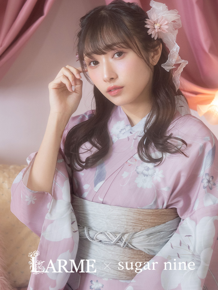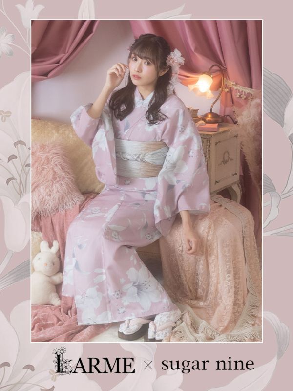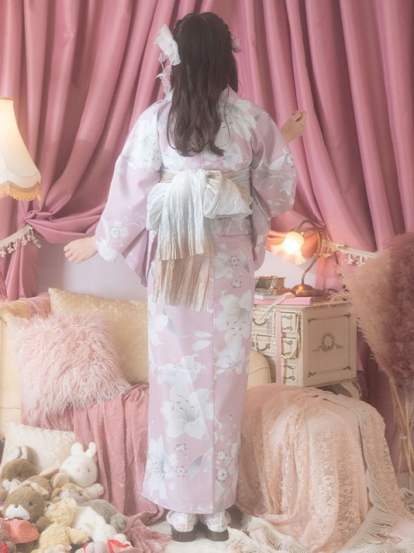 可愛さをプラスする優しいピンクカラーにモノトーンの上品な百合柄を合わせて写真映え間違いなしの着こなしに。