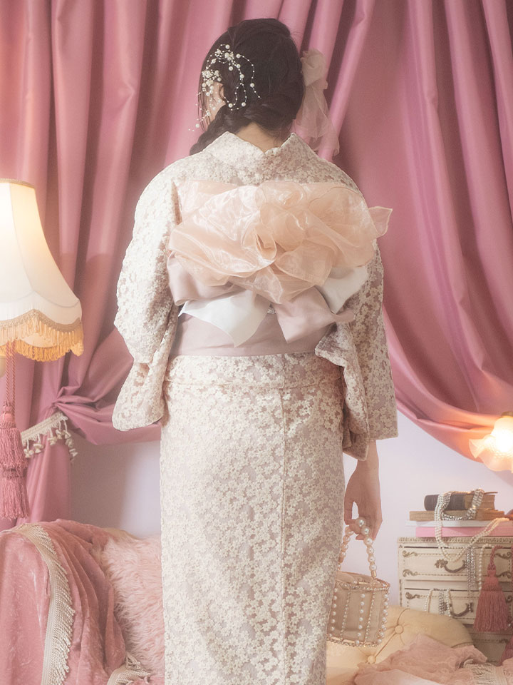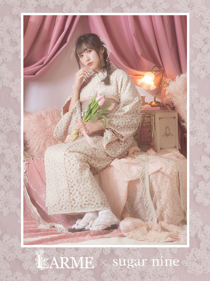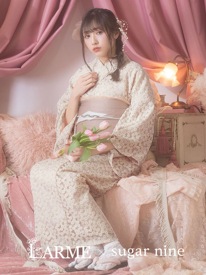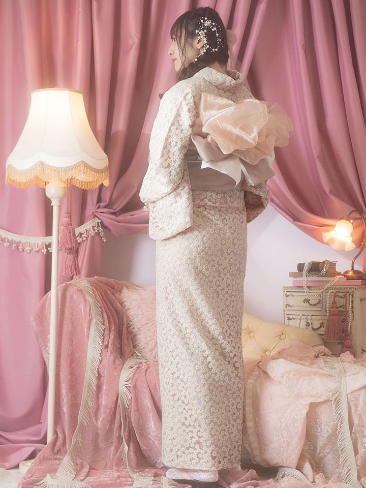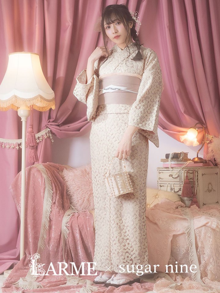 【即日発送】くすみピンク地x小花レース浴衣 【浴衣3点セット 浴衣/帯/下駄】 [YMT]