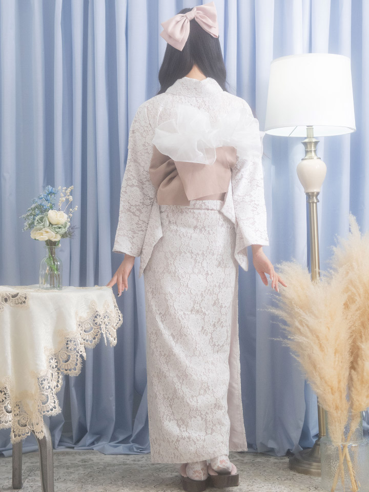 地のピンクにホワイトレースで覆ったスイートな浴衣