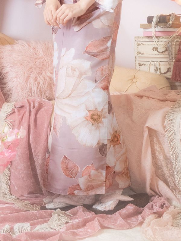 大人ガーリーな絶妙なピンク地に可憐な花が咲き誇り、