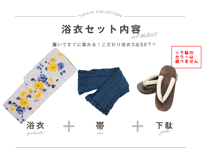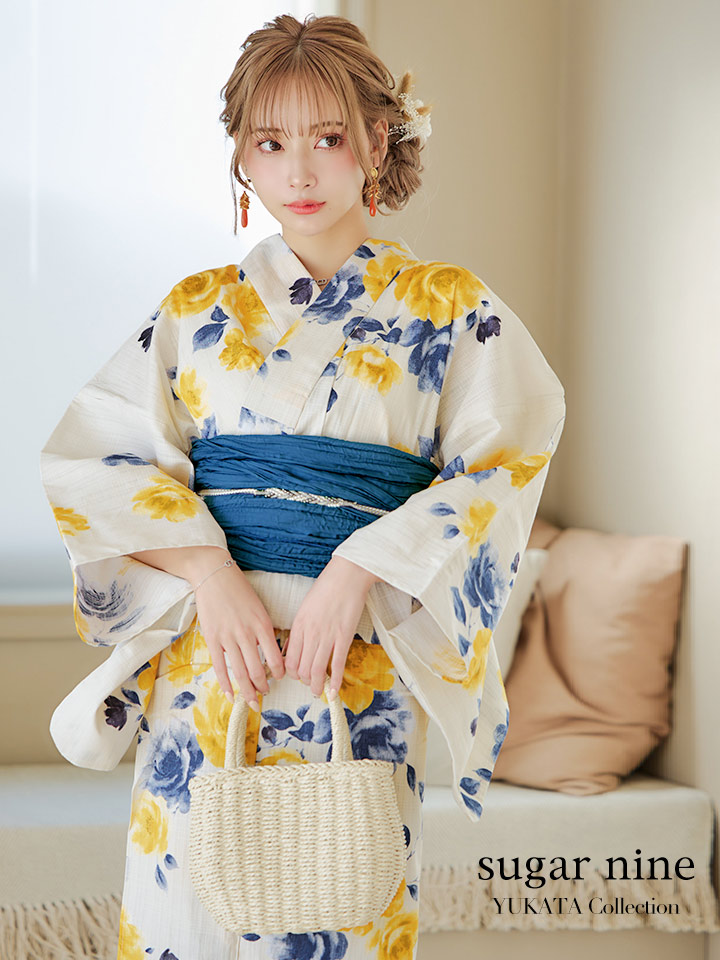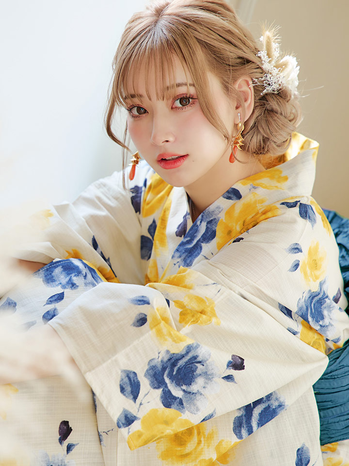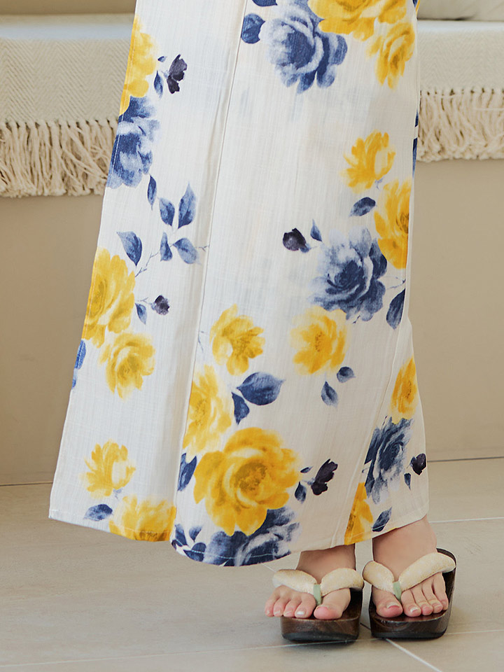 【即日発送】ブルーxイエローローズ 薔薇 バラ 浴衣 【浴衣3点セット 浴衣/帯/下駄】 [FB02]