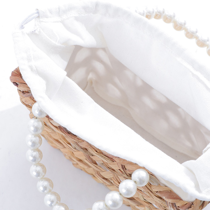 パールのハンドルがアクセサリーライクな八つ編みバッグ。