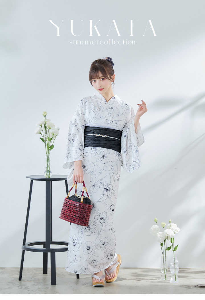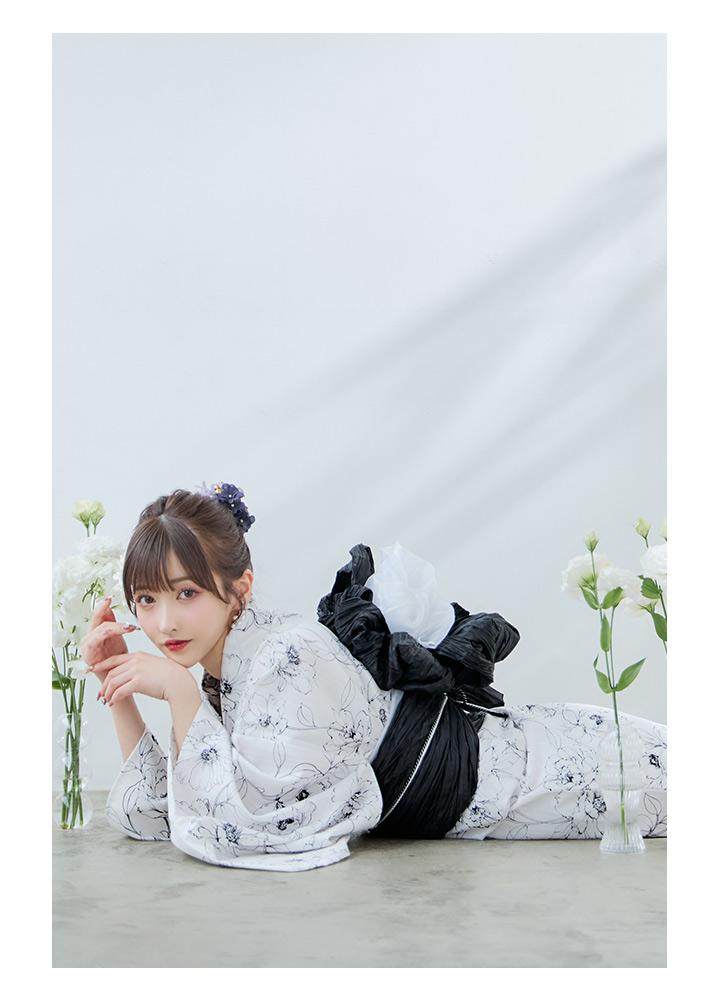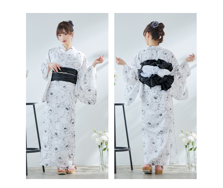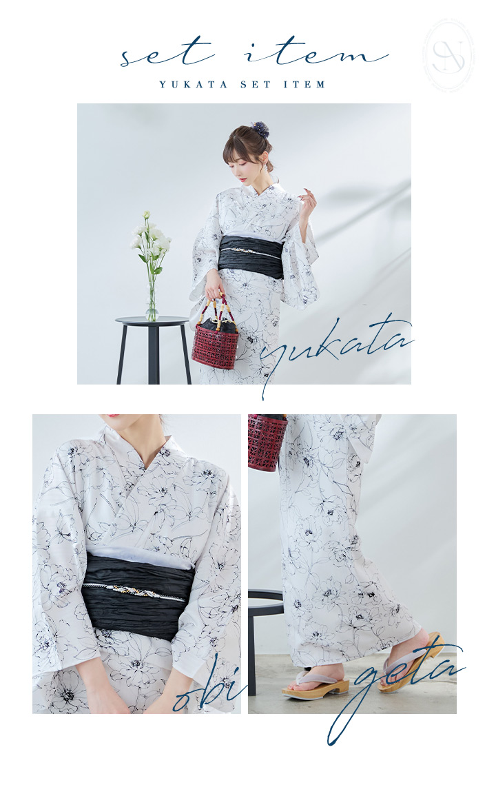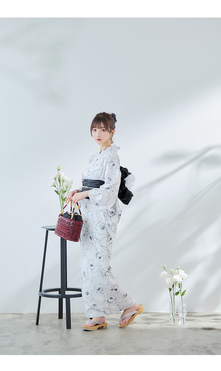【即日発送】ホワイト×線画フラワー浴衣 【浴衣3点セット 浴衣/帯/下駄】 [YMT] [Y-8093-ok-W-F-24RC]