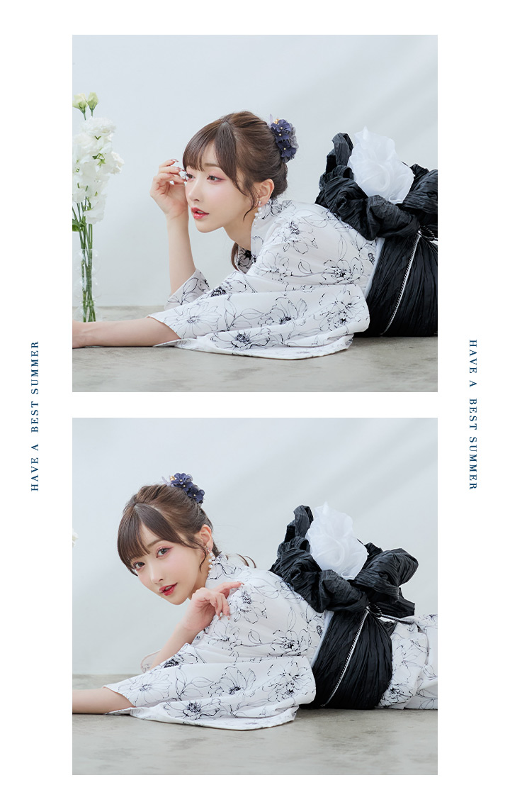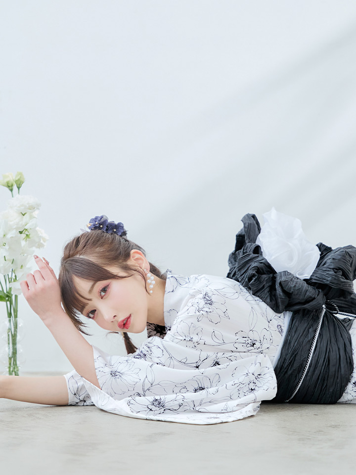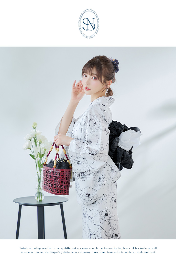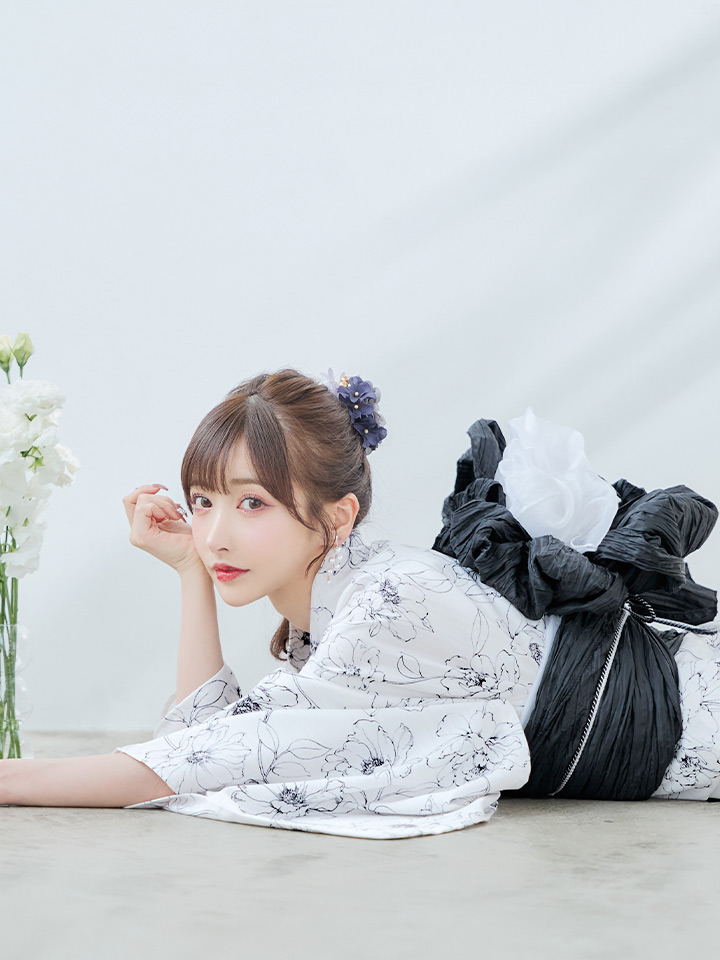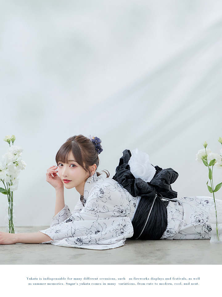 【即日発送】ホワイト×線画フラワー浴衣 【浴衣3点セット 浴衣/帯/下駄】 [YMT] [Y-8093-ok-W-F-24RC]