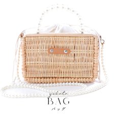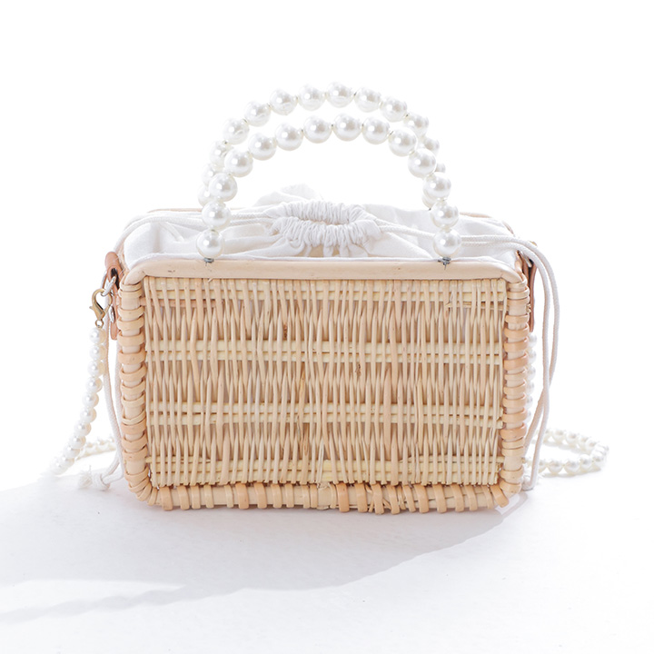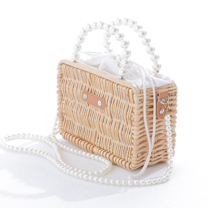 パールのハンドルの長方形型のランタン編みカゴバッグ。