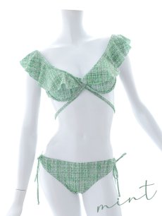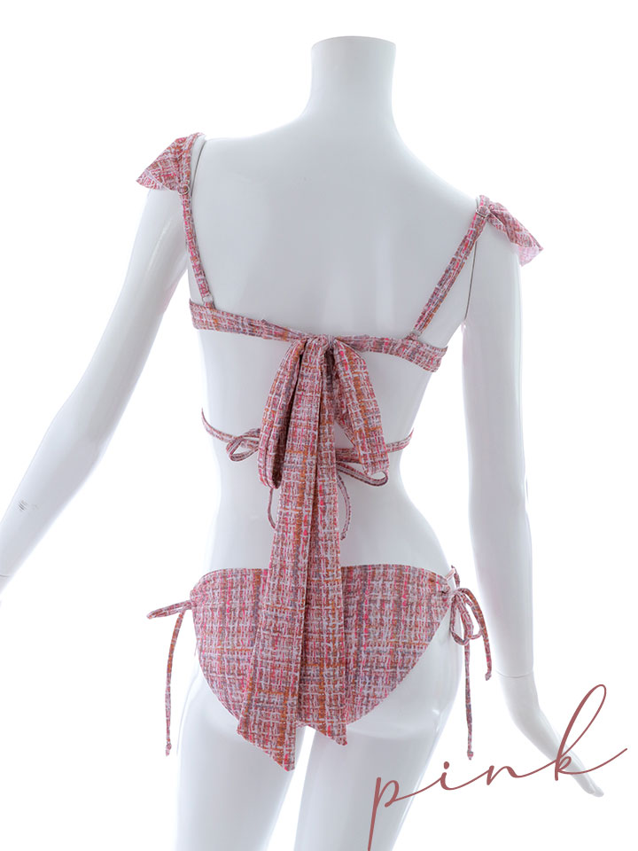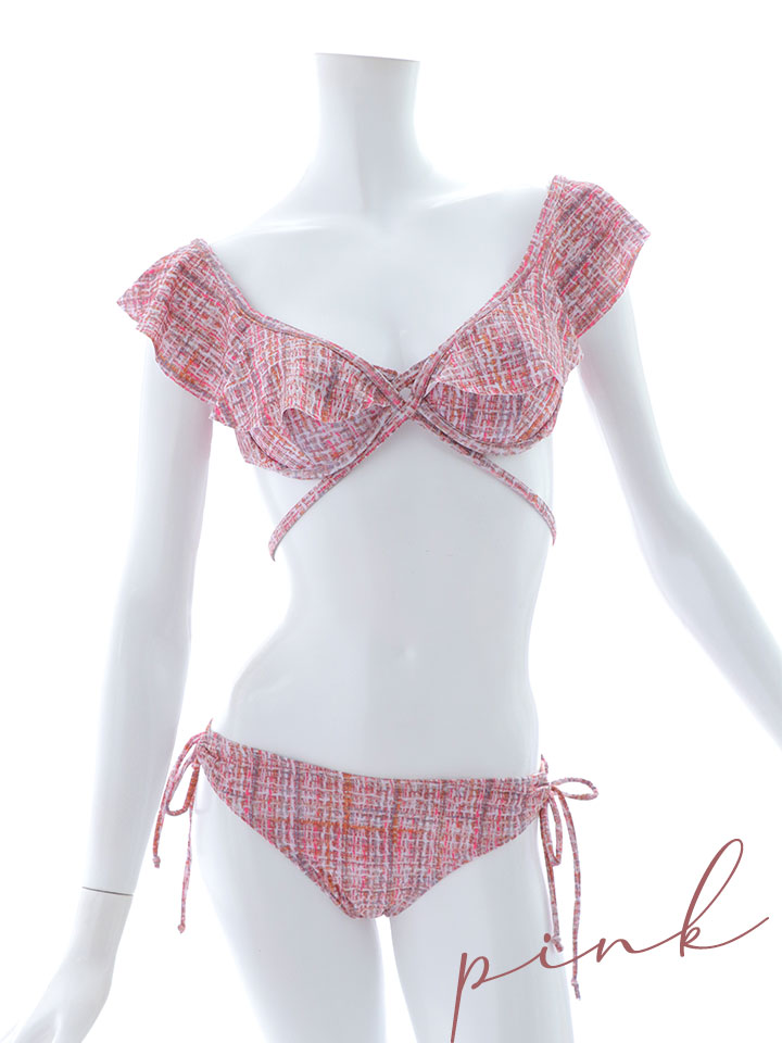 【即日発送】【ビキニ】【水着】肩フリルツイード柄ビキニ 2点セット[YMT] [M234dzj-24NN-MI-1]