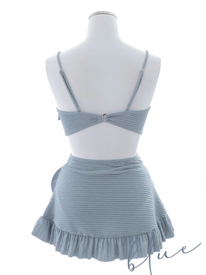 露出少なめ 体型カバー ツイード バッククロスリボン バックリボン ブルー水着 ワッフル水着 ビッグリボン