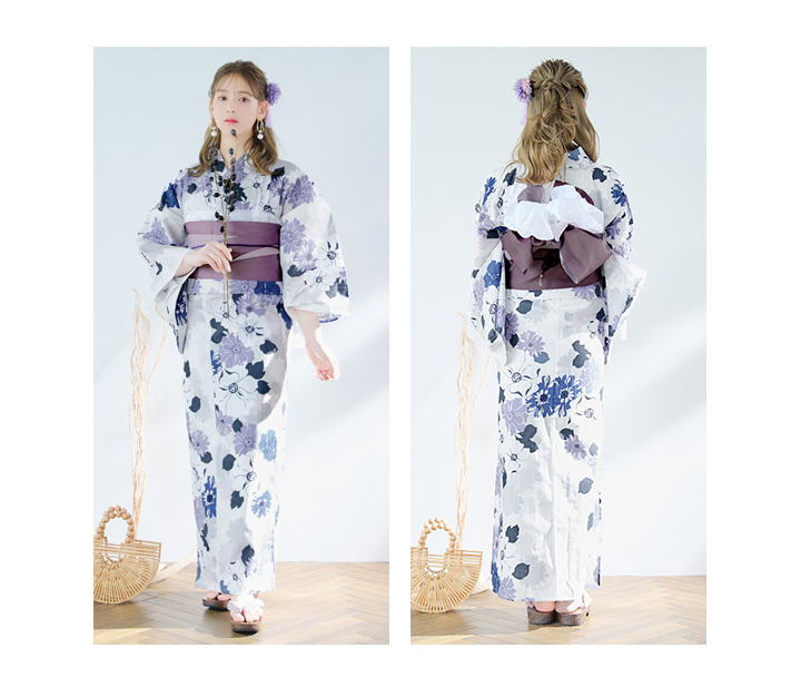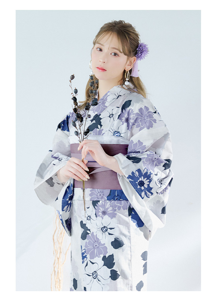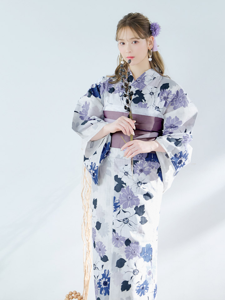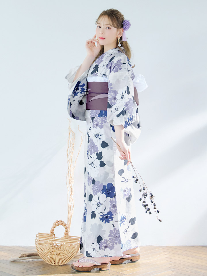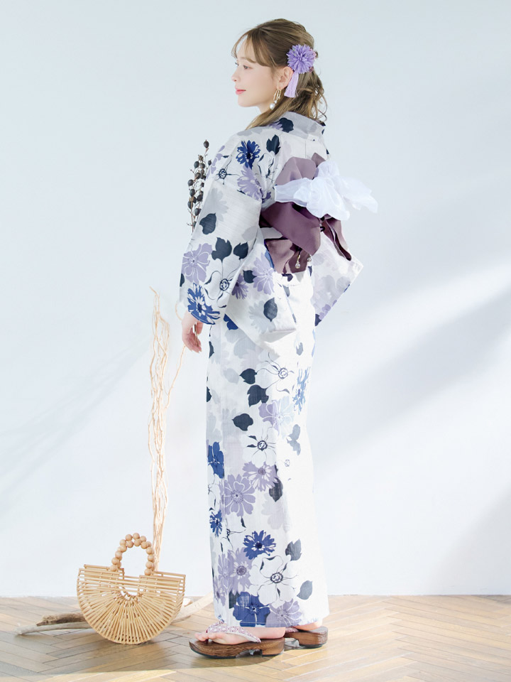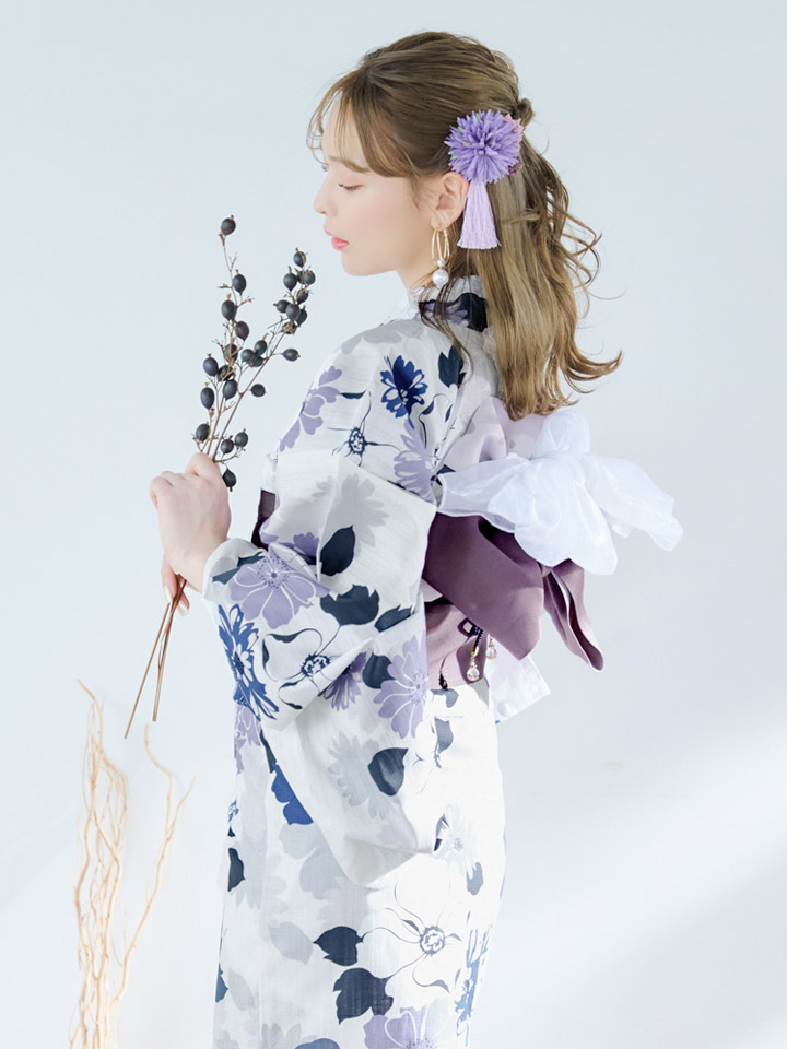 白地にトーンの様々なパープルとネイビーのフラワーが散りばめられた可憐ながらも洗練された印象を残す夏浴衣。