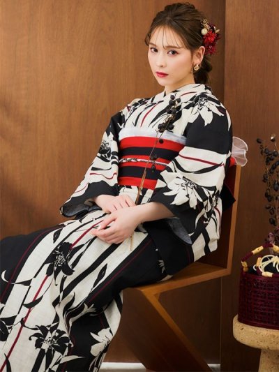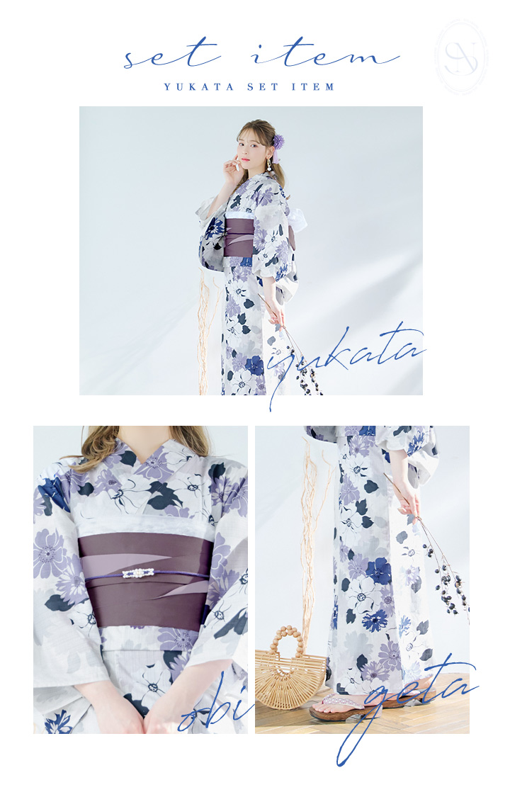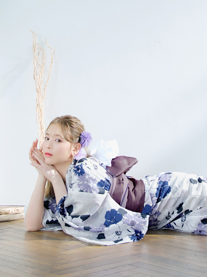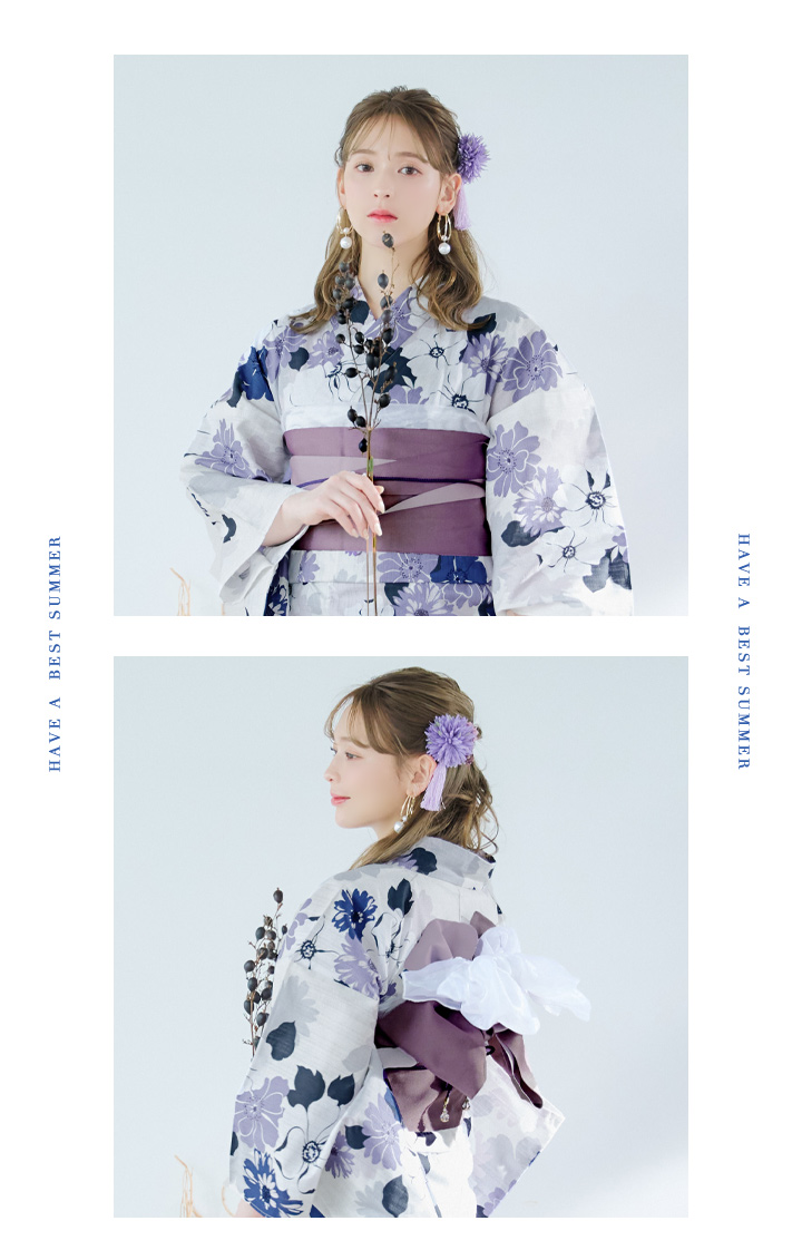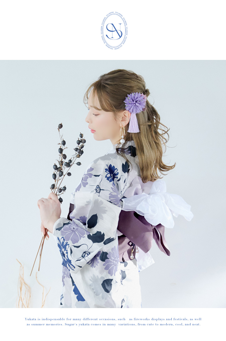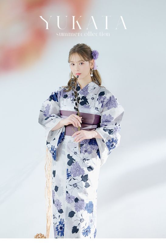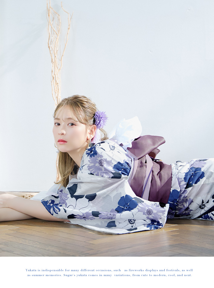 白地にトーンの様々なパープルとネイビーのフラワーが散りばめられた可憐ながらも洗練された印象を残す夏浴衣。