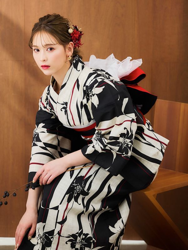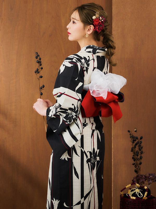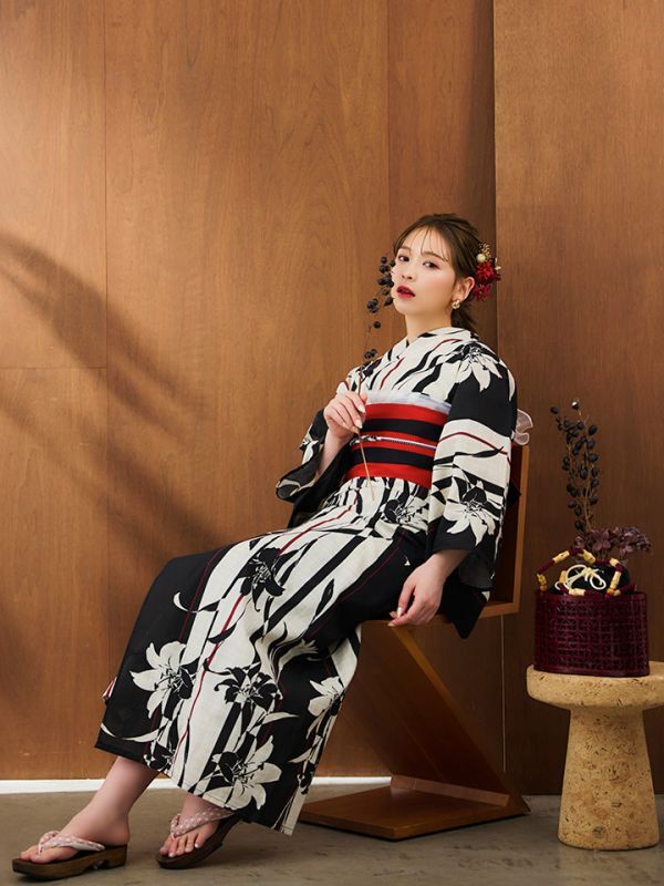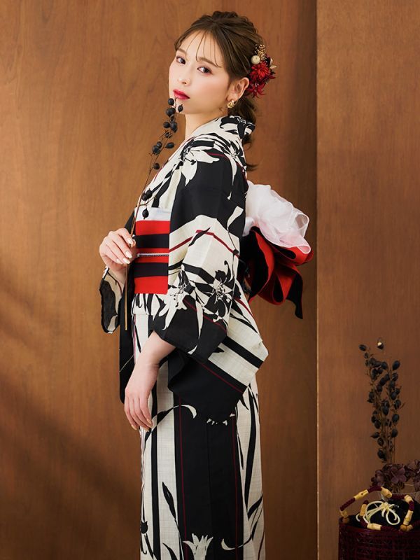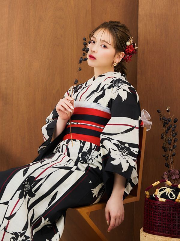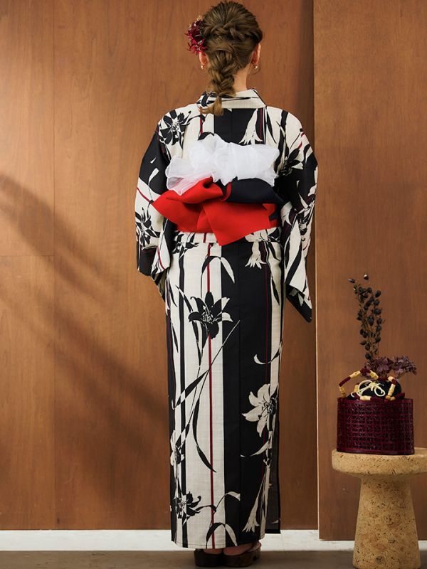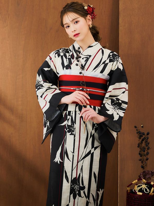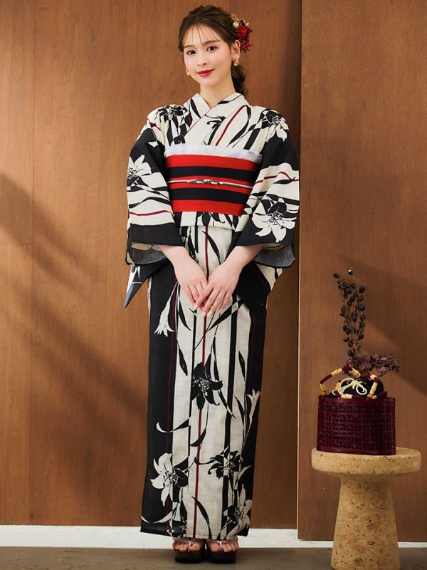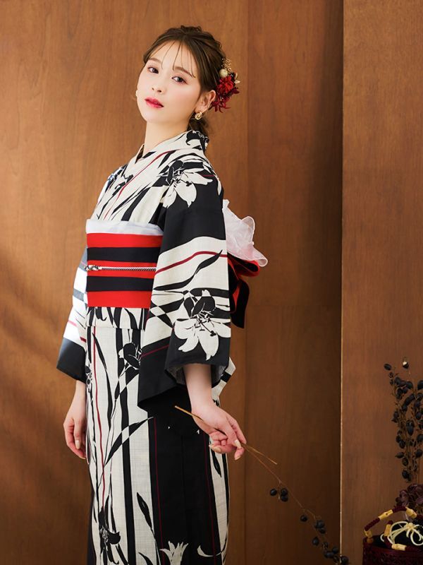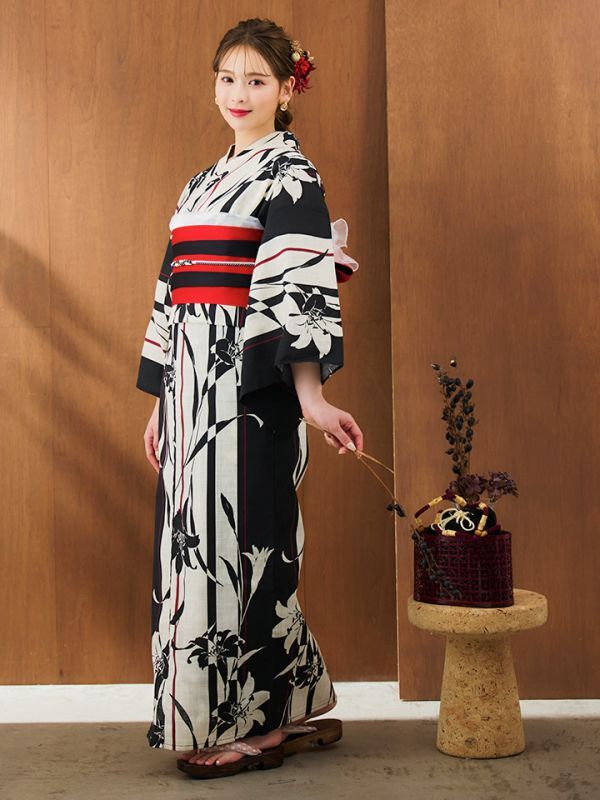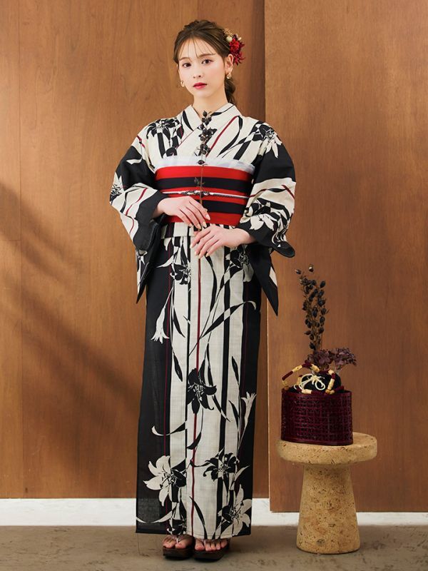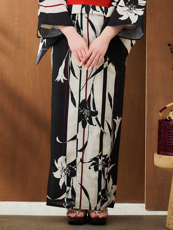 【即日発送!】ストライプ×百合レトロモダン浴衣 【浴衣3点セット 浴衣/帯/下駄】 [YMT] [Y-4063-ok-B-F-24IE]