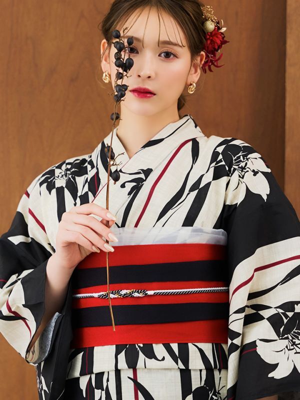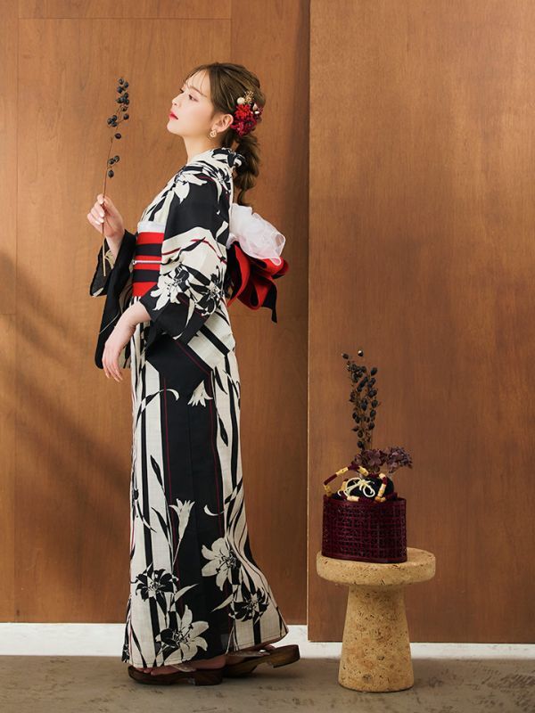【即日発送!】ストライプ×百合レトロモダン浴衣 【浴衣3点セット 浴衣/帯/下駄】 [YMT]
