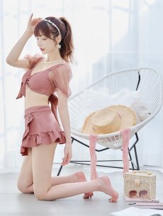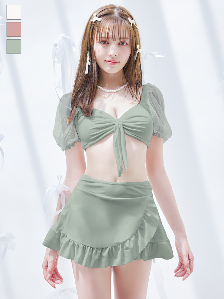 【即日発送】【ビキニ】ドットシアースリーブスカート付きビキニ 3点セット【水着】[YMT] [M218dzj-24NN-W]
