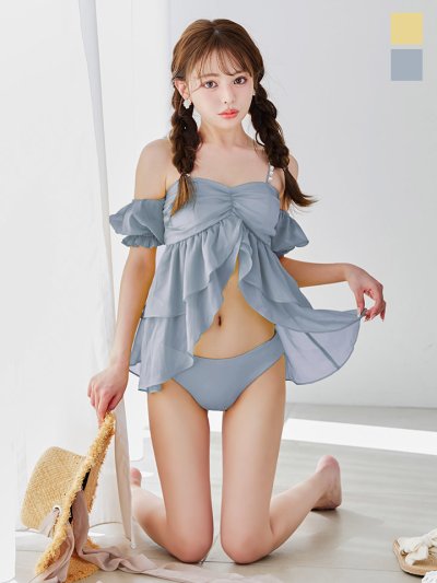 【即日発送】【ビキニ】【水着】シアーチュニック付きハイウエストビキニ 3点セット[YMT] [M247dzj-24RC-BL]