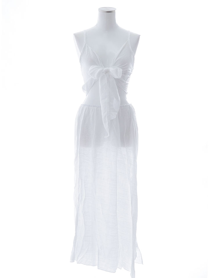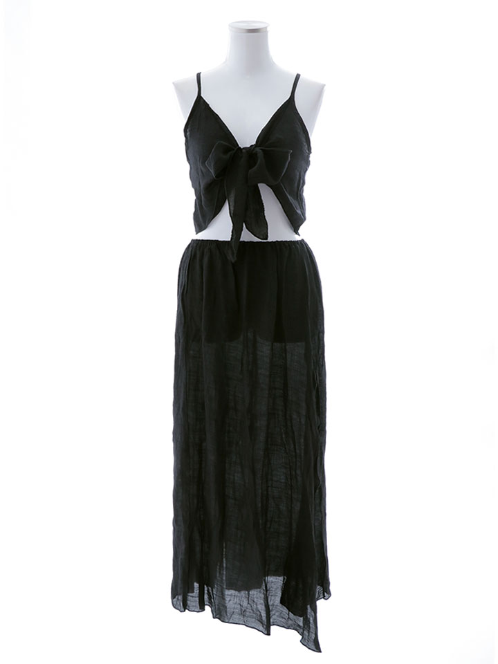 バストシアーリボンとハイスリットスカートのセットの洗練された水着カバーアイテム。