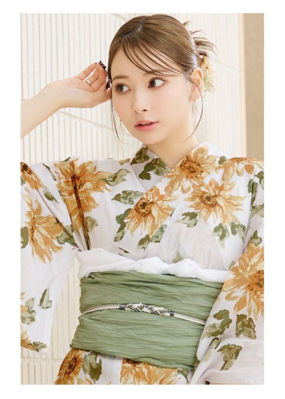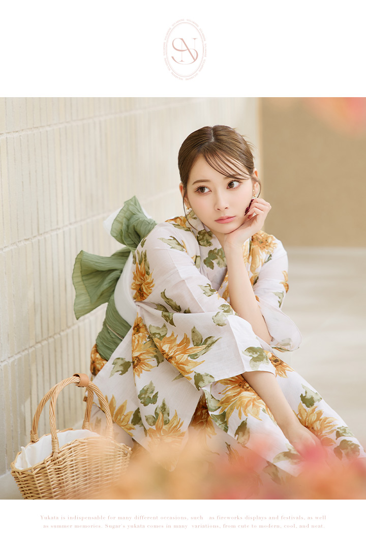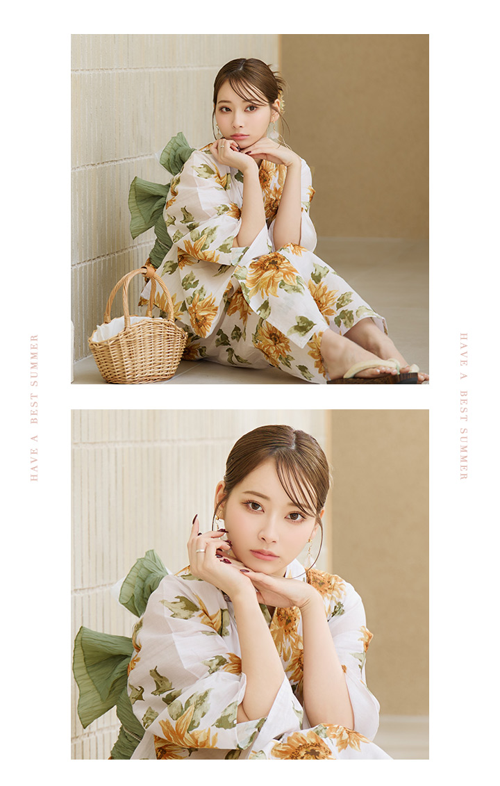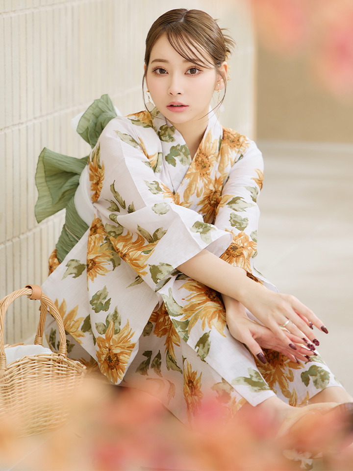 白地に咲き誇る水彩の向日葵のはんなり大人浴衣♥