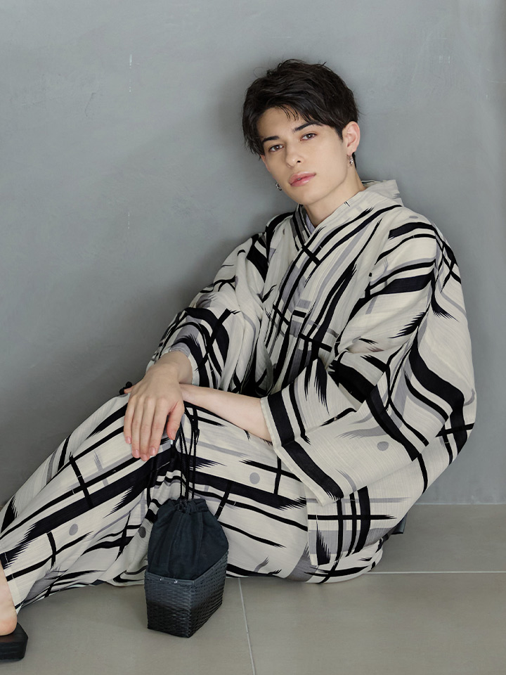 ストライプ地にブラックとグレーのラインのデザインがモダンでオシャレな夏浴衣