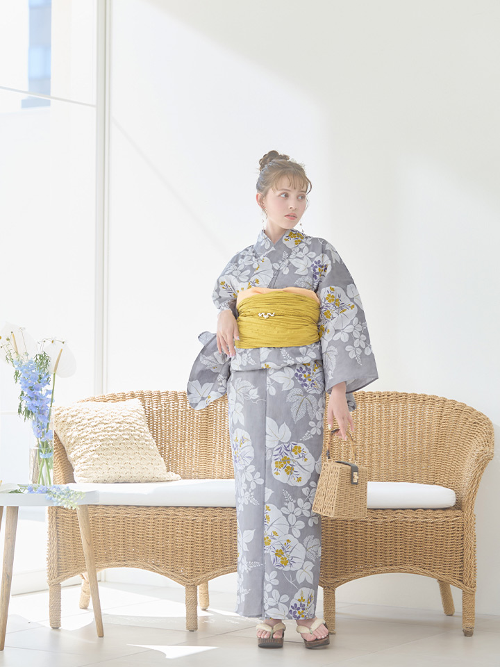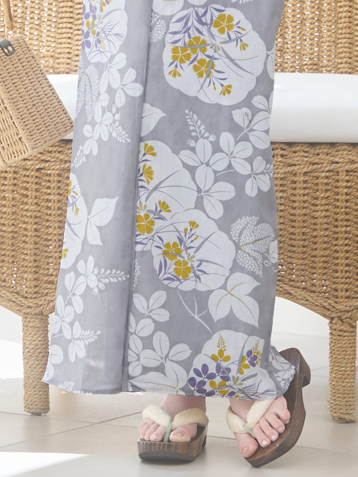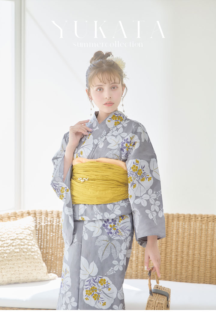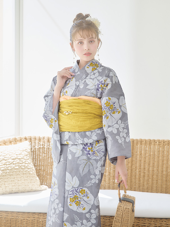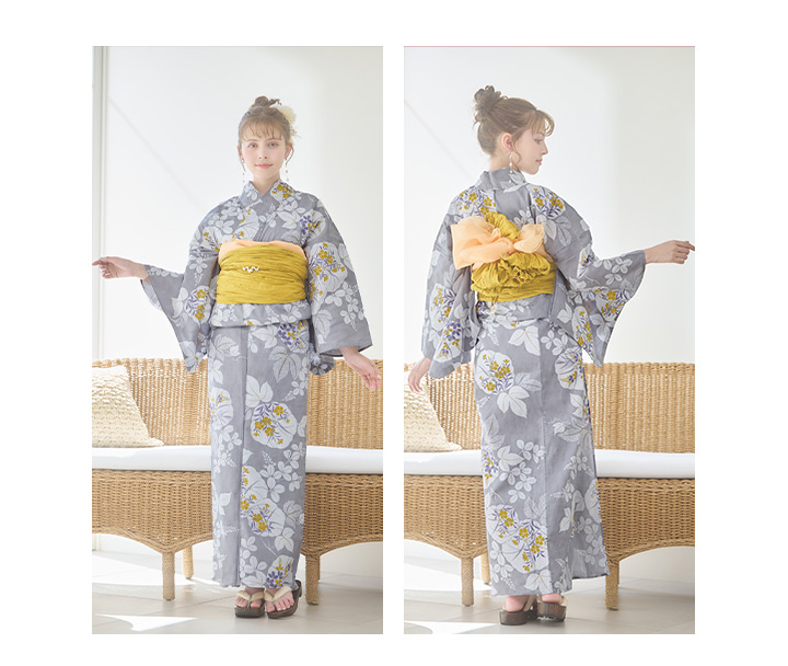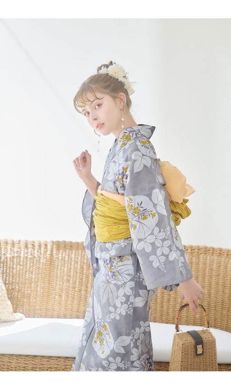 【即日発送】グレー×フラワー浴衣 【浴衣3点セット 浴衣/帯/下駄】 [YMT] [Y-8086-ok-GY-F-24NN]