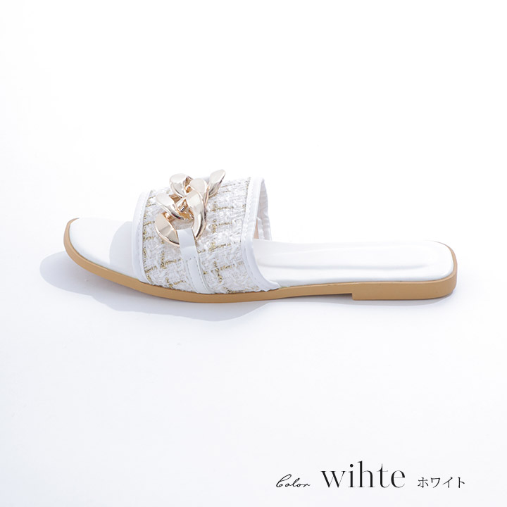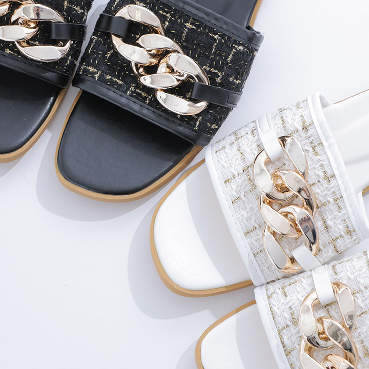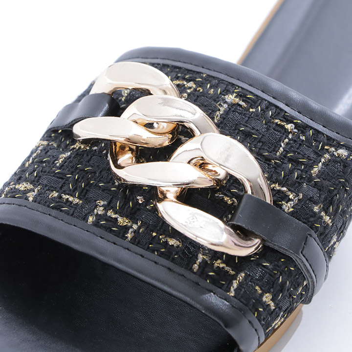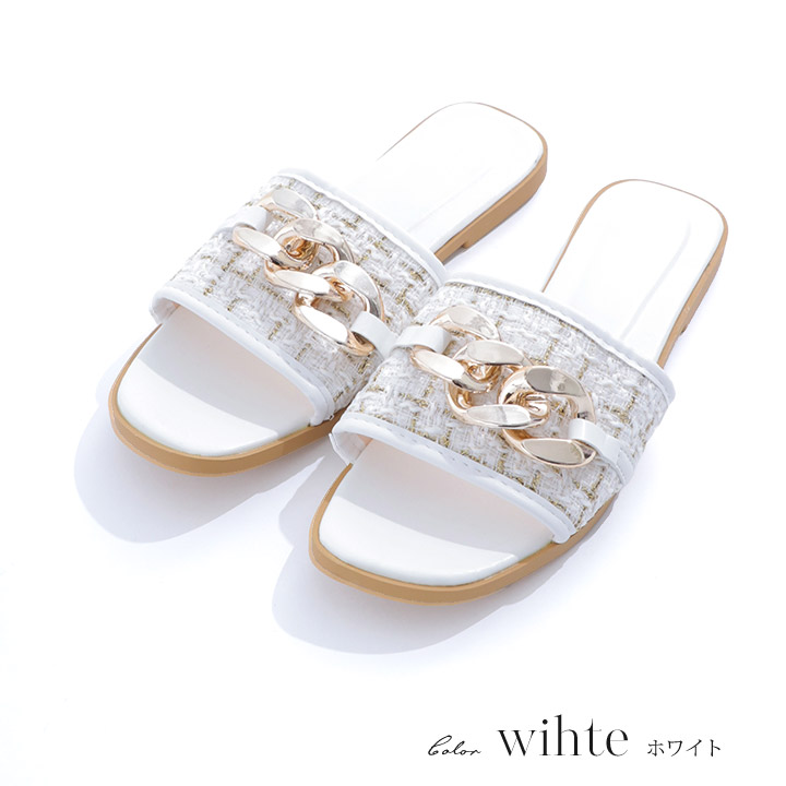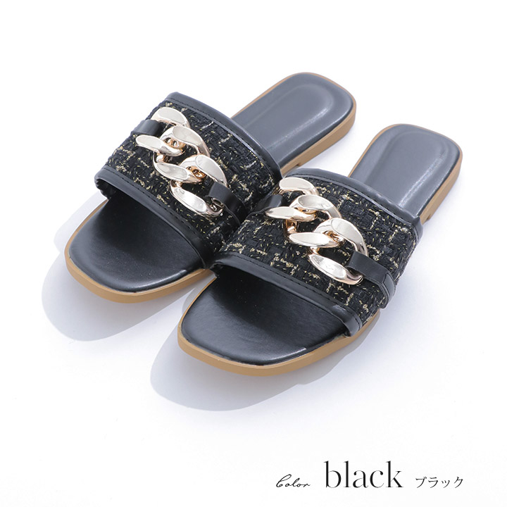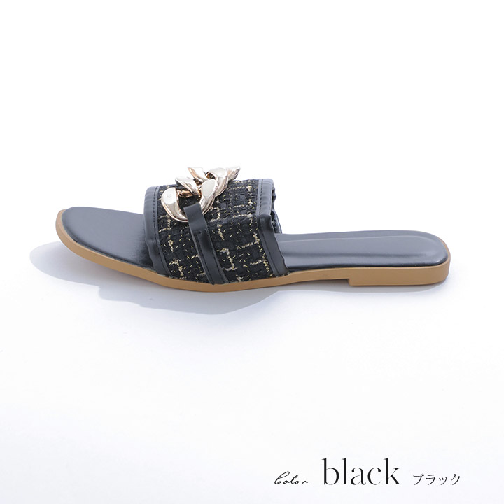 ツイードxゴールドチェーンが高級感溢れるローヒールサンダル♡