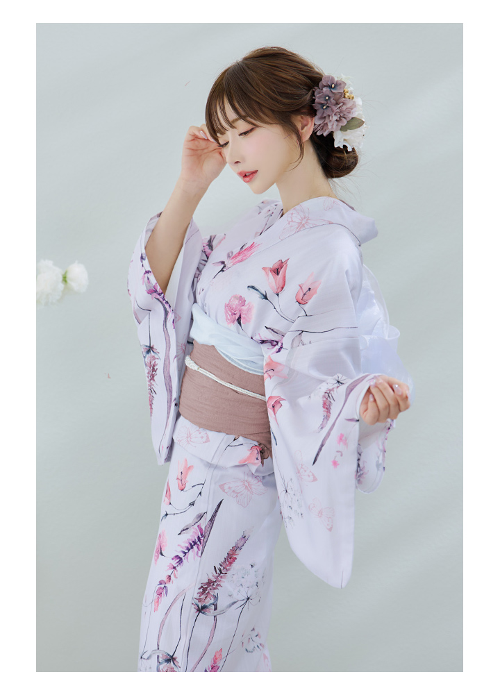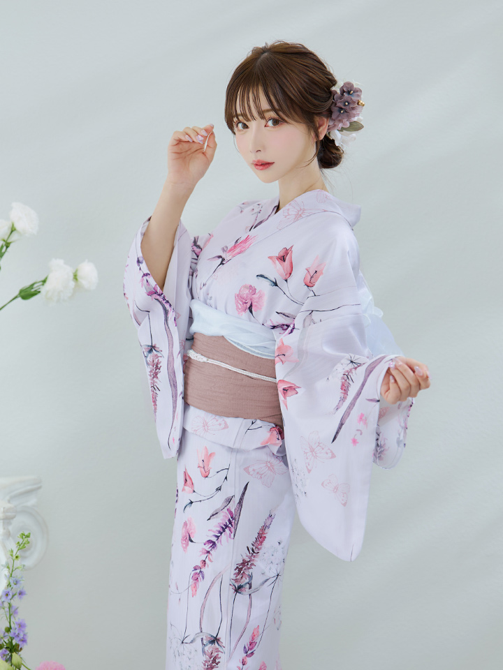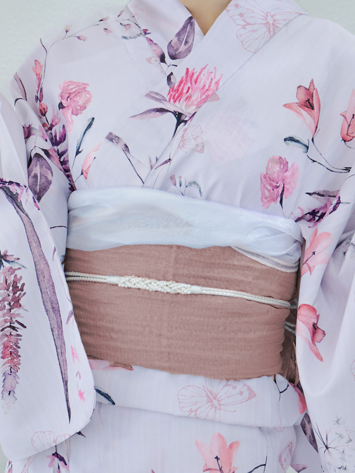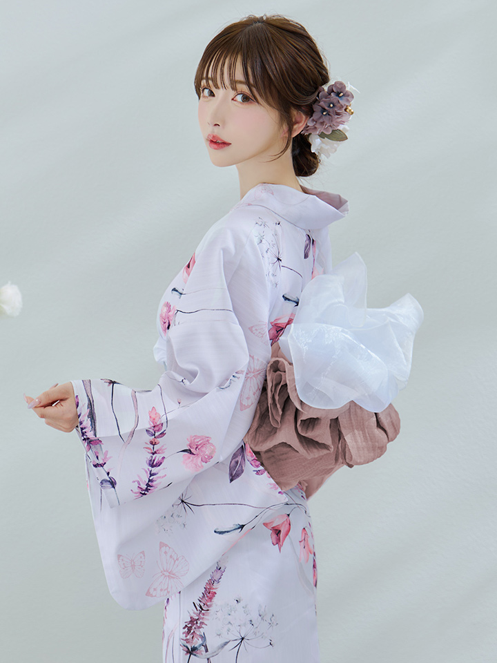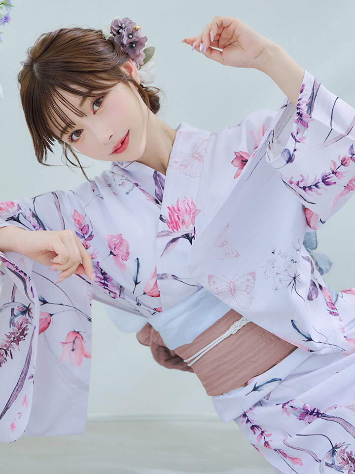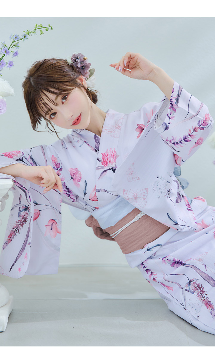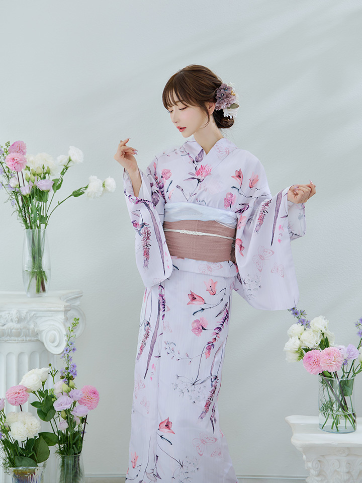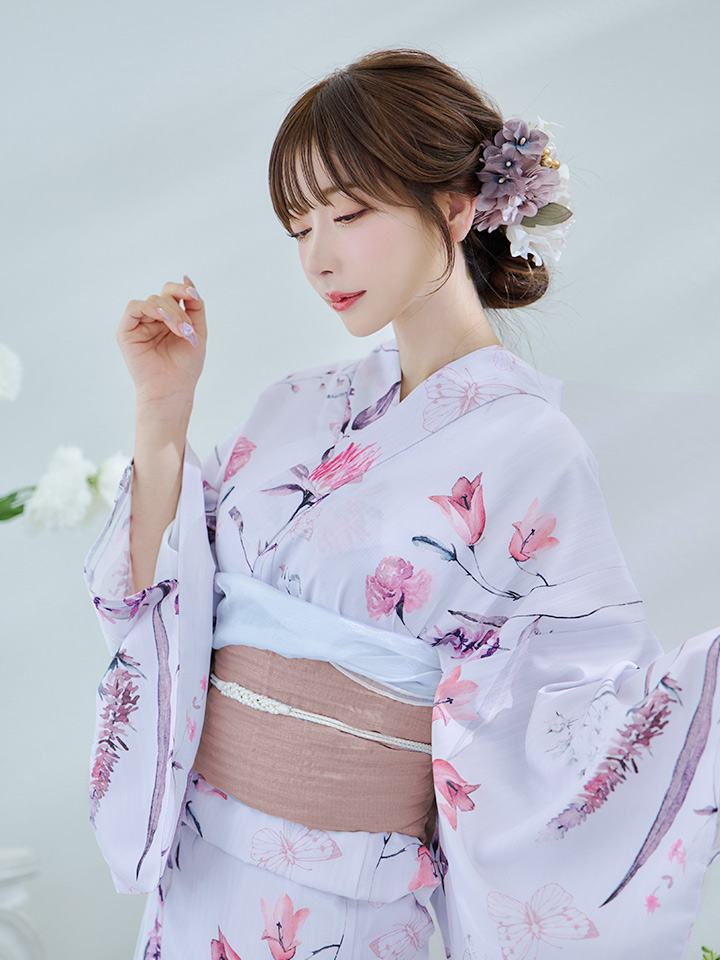 優しいグレージュ地に描かれたボタニカルフラワーと蝶々が涼しげで爽やかな浴衣♥