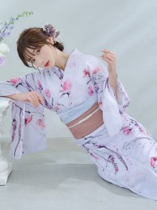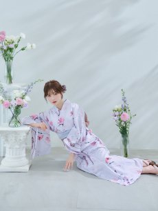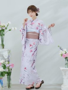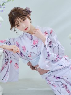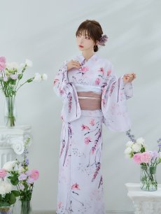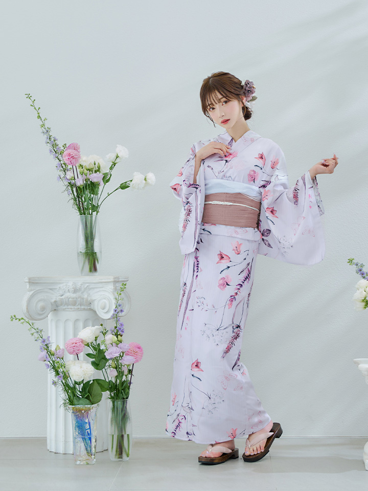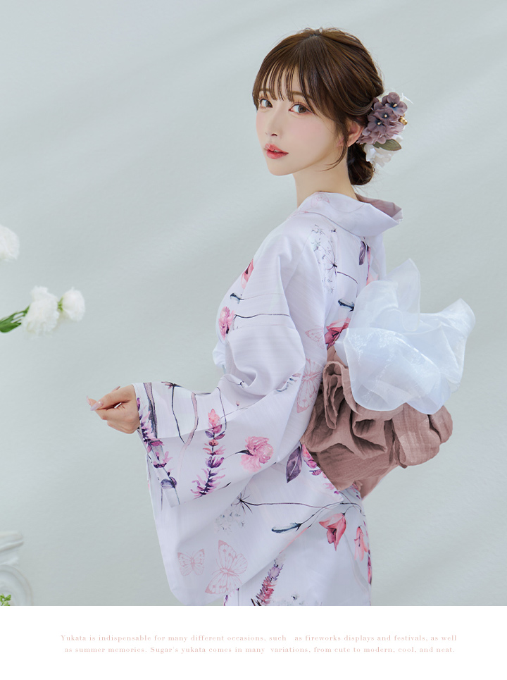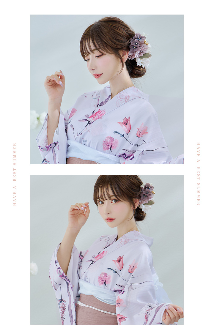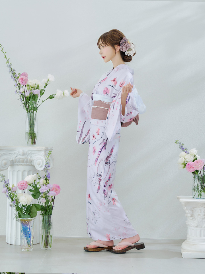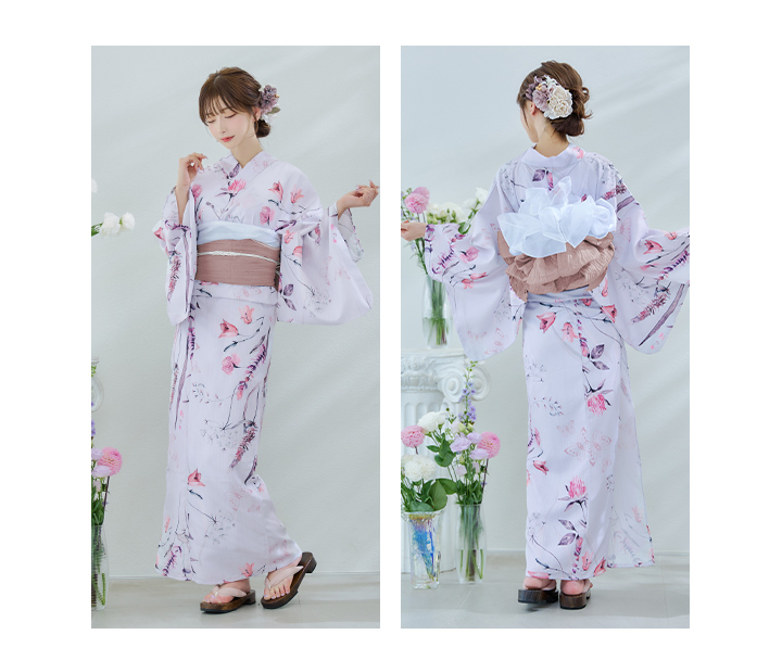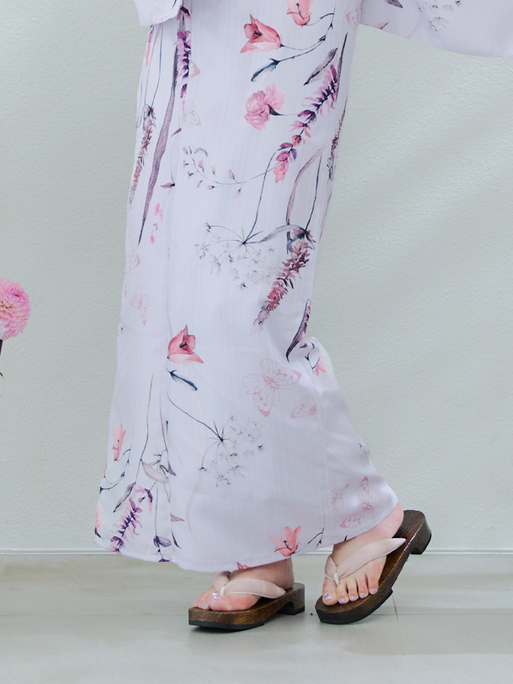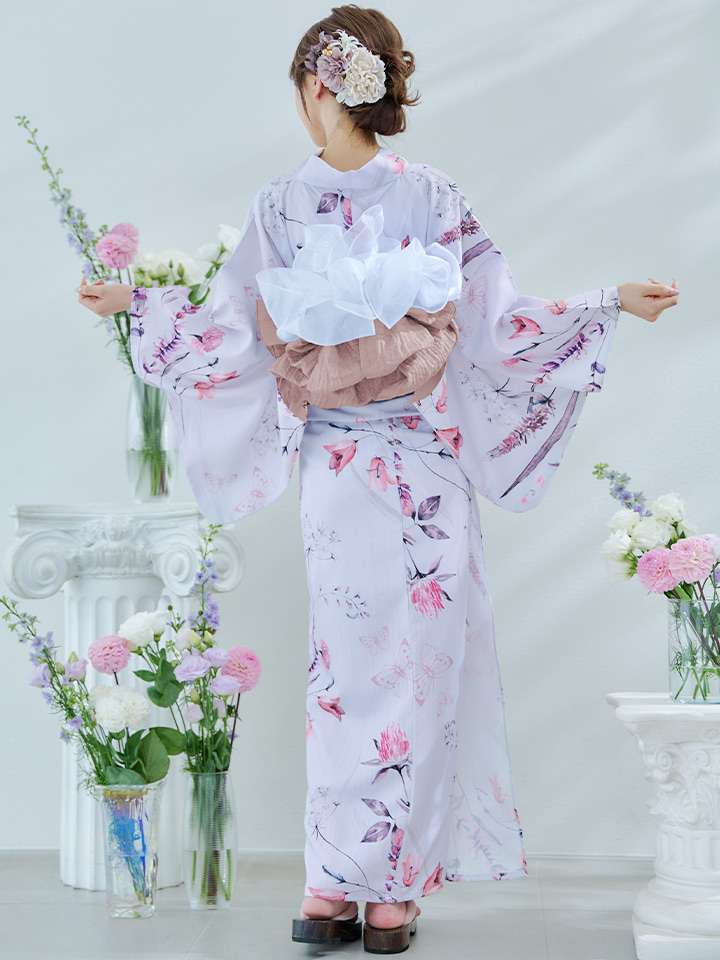 優しいグレージュ地に描かれたボタニカルフラワーと蝶々が涼しげで爽やかな浴衣♥
