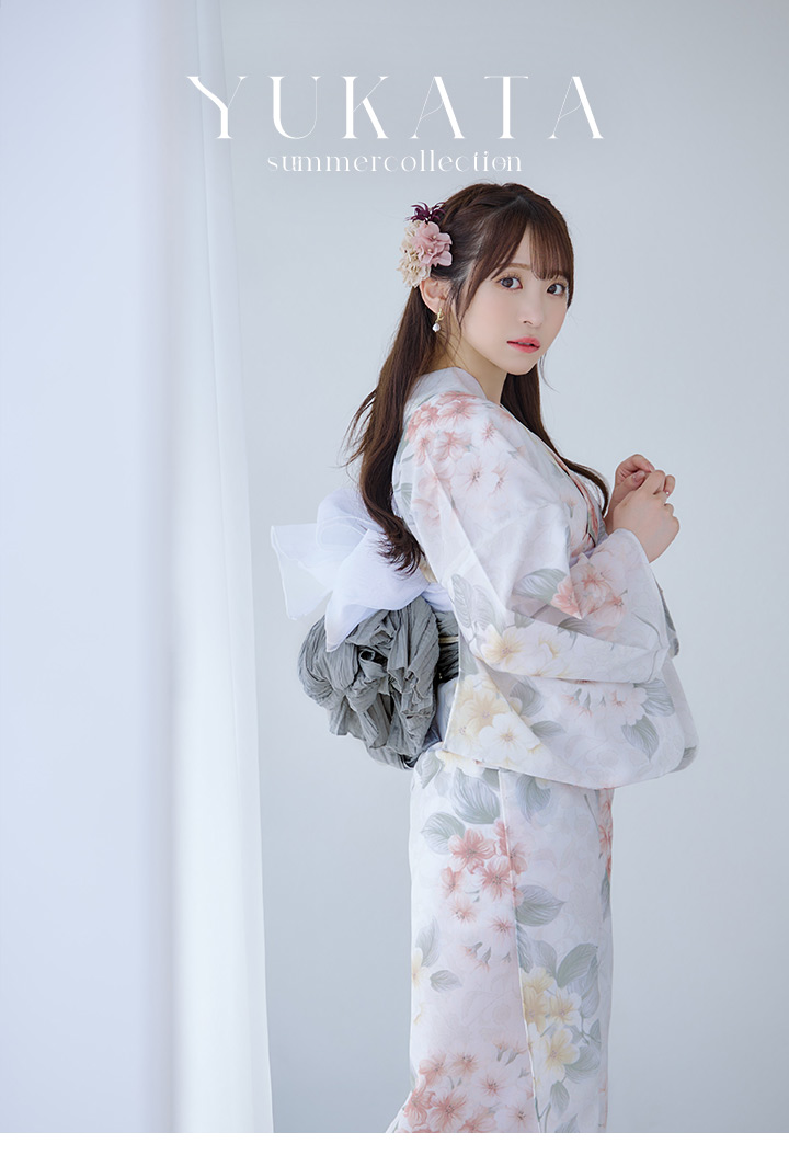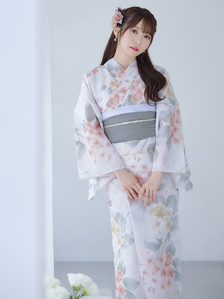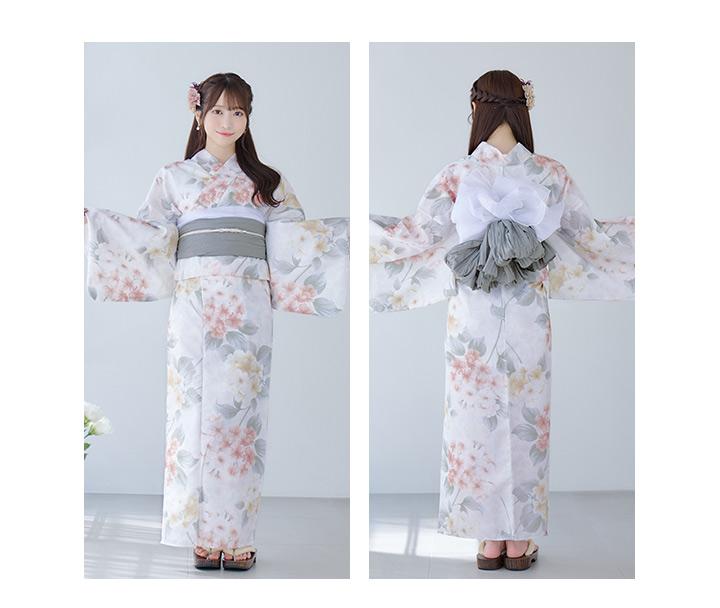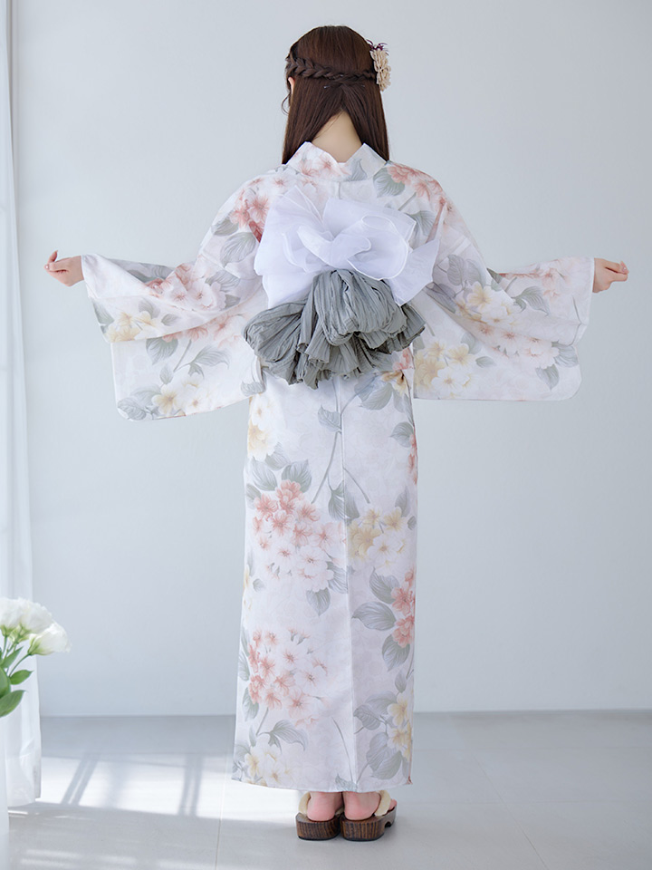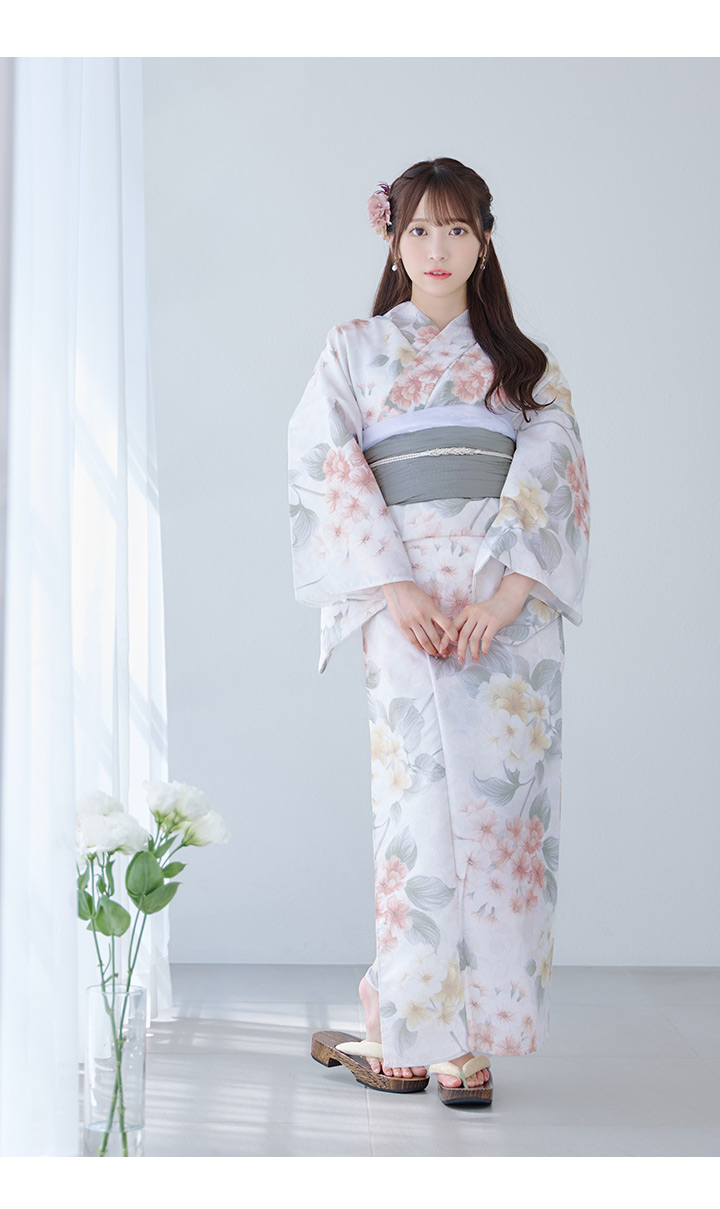 ホワイトベージュに花束のような紫陽花が優しさ+華やかさをまとう夏浴衣。