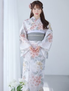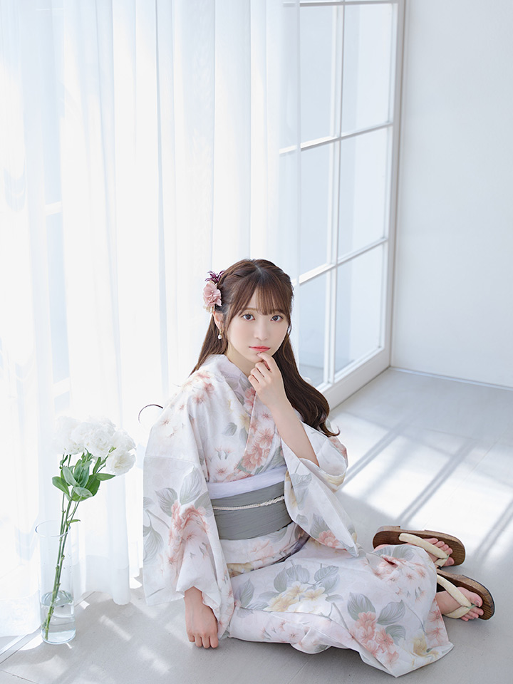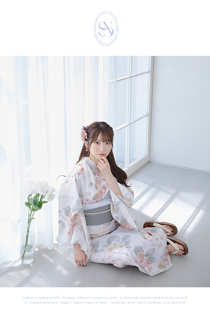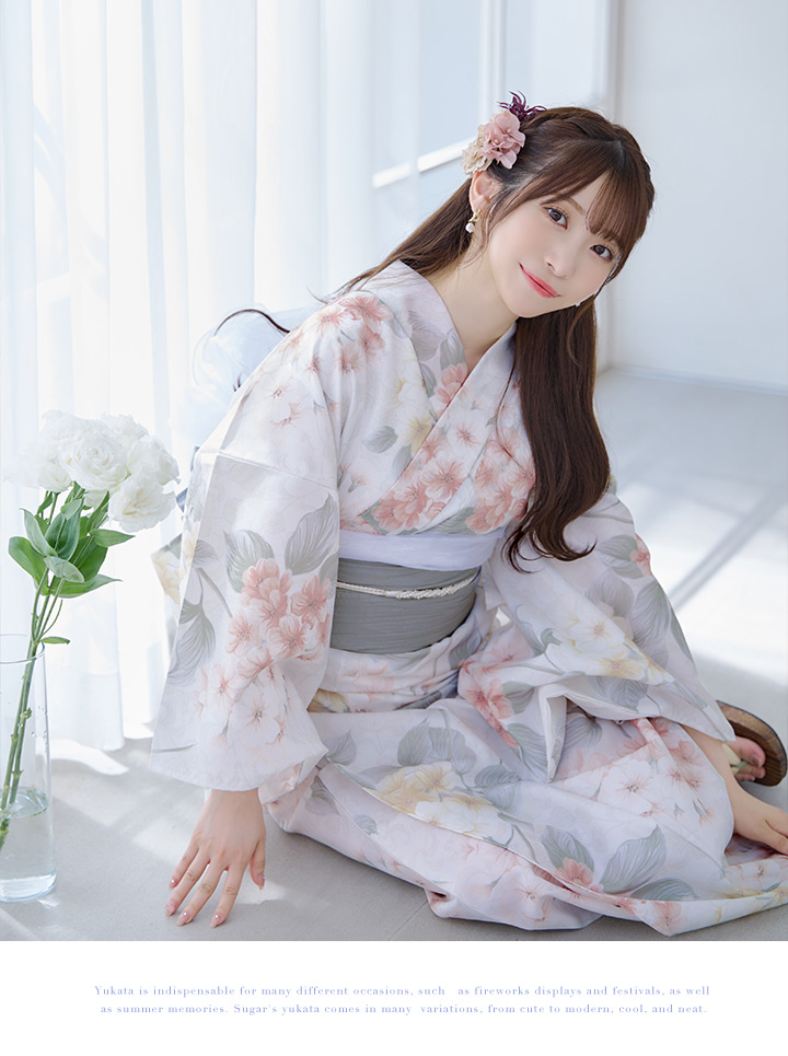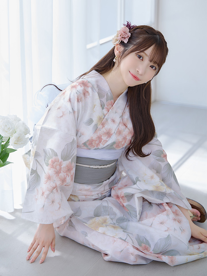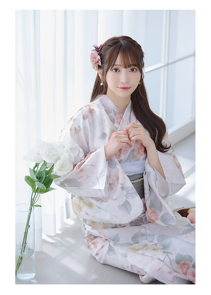 ホワイトベージュに花束のような紫陽花が優しさ+華やかさをまとう夏浴衣。